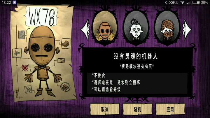 楼主pc版活了200多天,会玩的同学知道这个游戏前期发育起来后期就是磨时间。手机版目前英文版一个档正在进行攻略,仅仅35天。那就说一下这35天我发现的与pc版不同的一些东西。楼主春天开局,与pc版不同的地方,首先来说天气。手机版大大降低了游戏难度,这点从天气就可以看出来。pc版春天基本天天都是下大雨,手机版则是有一天小雨有一天没雨,大雨很少,这大大的提高了玩家的san值,前期不会过早碰到影怪【顺便吐槽一下手机版的打怪走位系统,这游戏走位不像电脑一样操作简单,基本就是打怪时候不小心点到其他物品上人物就不动了,会被打掉血。吐槽】夏季来讲,雷电雨的数量比pc减少的太多了,也可能是手机上我一个档看不出来什么吧,反正我是没有遇到过。这样就不用费心思去做避雷针进行防御了。秋季和冬季目前还没玩到,有待评测。下边讲关于生物的变动。没啥说的,某些生物血量降低不少,打怪手感就能体验出来,比如小狗狗还有机械木马【还有很多】。攻击次数少了,你存活的几率也就大了。评论区再说其他的一些东西。我怕字数超了,新人第一次发表评论