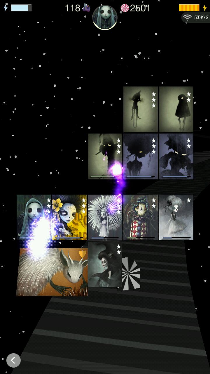 游戏需要联网,进去游戏加载个半分钟左右就可以玩了,开始送你一些卡牌,根据步骤看完游戏解说会送你鱼头,鱼头可以抽卡牌和买糖果,糖果的作用是提升卡牌等级,然后探险的时候刚开始怪不会还手,升级也快。探险的背景音乐很诡谲,刚开始是单调的奏乐,越往后走会听到隐约的女人哼唱的声音,时远时近。晚上估计听会渗的慌。