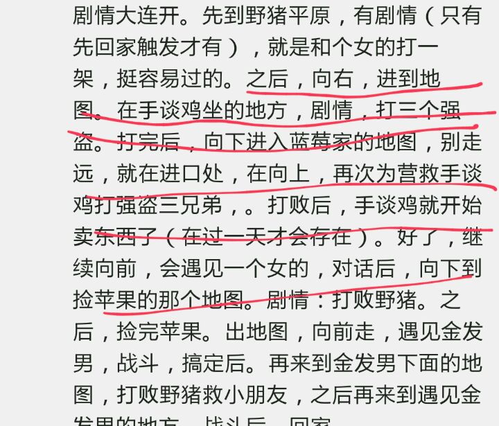 第一目:先有教学,跟着学完。之后多训练一下打木桩和收集兔子肉和叶子,回家合成加血量的肉,对了,不要忘记到最上面的地图中拿加魔法强度的药差不多后,到石头触发剧情(韩文不知什么意思),触发后,往石头下方的通道开启。下去后,和一个女孩战斗,打败她。再向右走,有士兵和他战斗,击败后,不能再前走。之后,向下有一个山洞,和里面的人(姑且叫人吧)对话,接的是任务(就像是手谈鸡的请求)。之后可以到最右边的神庙处,有一条龙,对话,对话后龙飞走。之后有士兵来,剧情玩后,回家不用再去神庙,进不去。这时若实力足够,到拿到法强叶子(最右边的图)中打败小恶魔(收服,小恶魔在前期很厉害,攻高还加血,不打也行,不影响剧情。之后,回家训练,炼药,睡觉。