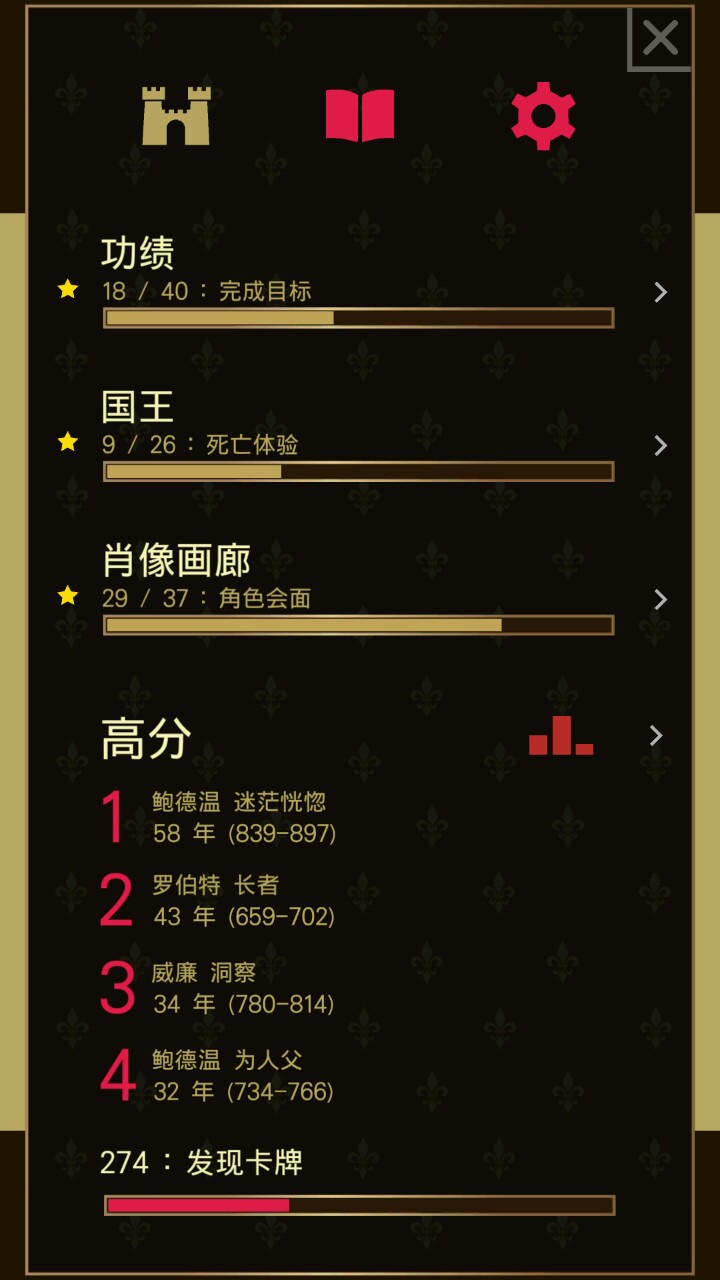 游戏中,你主要扮演的是一个国王……而你要做的就是使自己活下去!但是这并不是一件简单的事情,因为你控制着宗教,人民,军事以及财富,不管哪一项爆满或者为零你都将要面临死亡……而游戏中你并不能使你的国王复活,但是你却以控制下一代国王的命运继续进行着游戏,直到游戏通关!游戏主要考验你的应变能力以及控局能力,你需要对所有人的意见和话语进行答复,保持四力平衡,活到最后……当然并不是你一直保持四力平衡就可以活过千岁万岁……游戏里当你执政到差不多的时候,也是会因为疾病老死的(然而想老死并不容易)!接着说下这游戏给我的感觉吧!一开始我觉得游戏没啥意思,就是翻牌对话,控四力,后面才发现游戏并不止如此,而在于如何达成成就凑齐卡片……游戏并不是无限的,当你凑齐所有卡片,达成所有成就,游戏自然便会通关……想想这还真是有种诅咒的感觉在里面!总之游戏还是不错的,特别考验处理事情的能力!最后感谢手谈汉化组汉化了本游戏,让玩家能够更好的体验游戏!希望的玩家快来试试吧!看看你能靠几世国王通关吧!(恩。。。。运气也是一个关键吧!)