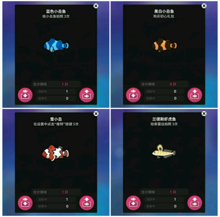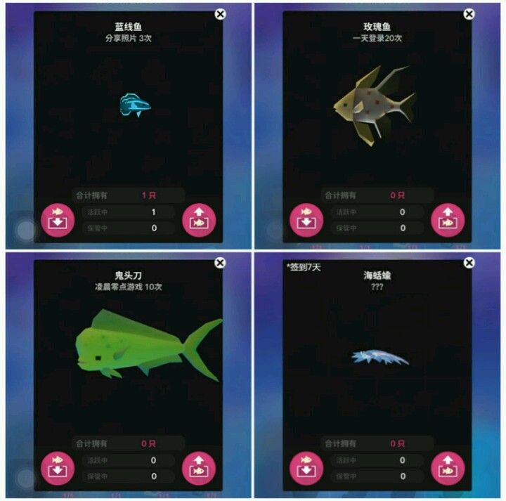 1.一天登录20次指一天打开20次游戏(不过最近重新玩的时候玫瑰鱼和雪小丑同时解锁了,估计是个bug