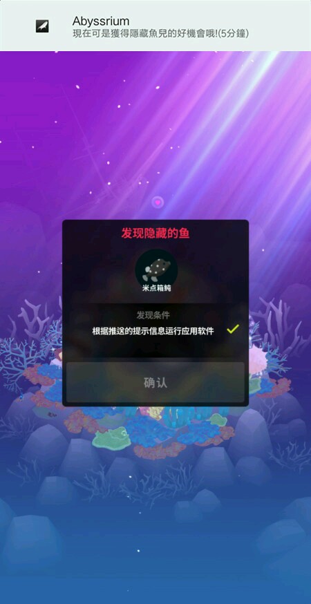 然后,推送分两种,一种是通知本时段收获了多少生命,这个并不是条件中说的。另一种内容是“现在可是获得隐藏鱼儿的好机会哦!(5分钟)”,如下图,这就是了。要在5分钟内通过这条推送进入游戏,然后就会解锁相关隐藏鱼了。