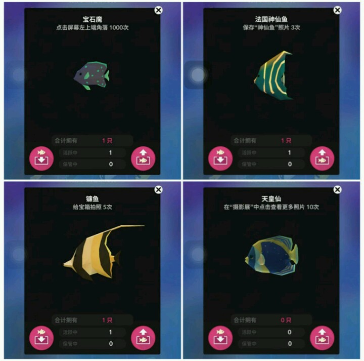 啊,有必要说明一件事,隐藏鱼的图有一部分是网上的,因为我本来做好图发现蓝色小丑鱼和锤头鲨忘了弄,结果不小心把游戏卸载了orz重新安装好打开后又不小心把之前的珊瑚石LV3000存档覆盖了QAQ然后又没有什么时间玩,结果现在重新玩珊瑚石还没到LV500……所以想重新做图可是又没办法只好从网上找了……