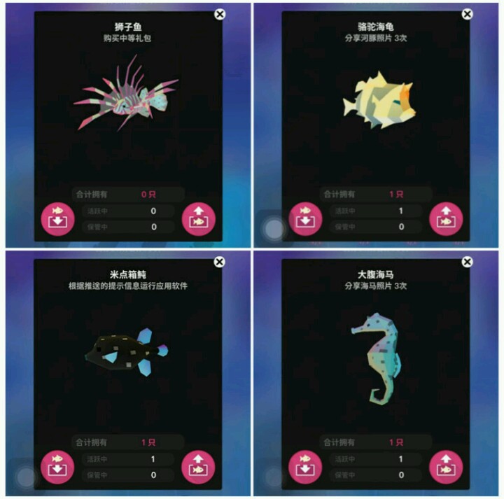 游戏的画面很精致,各种海洋生物也力求真实。无论是喜欢呆在海葵中的小丑鱼,还是喜欢成群出没的海豚,不仅外形惟妙惟肖,连习性也一一对应,尽量真实(虽然很多鱼的名字翻译不走心。目前游戏自带繁简中文,所以不需要下载汉化版的说~