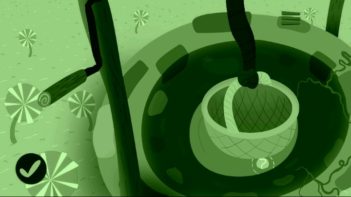 在野餐垫旁边拿到篮子,用水井绳拴住篮子,点击井再点篮子,把球捞上来。