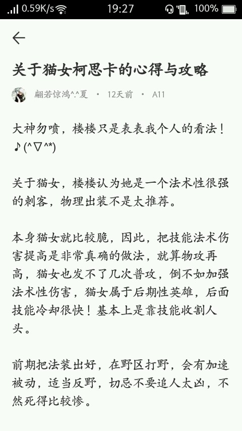 本身猫女就比较脆,因此,把技能法术伤害提高是非常真确的做法,就算物攻再高,猫女也发不了几次普攻,倒不如加强法术性伤害,猫女属于后期性英雄,后面技能冷却很快!基本上是靠技能收割人头。