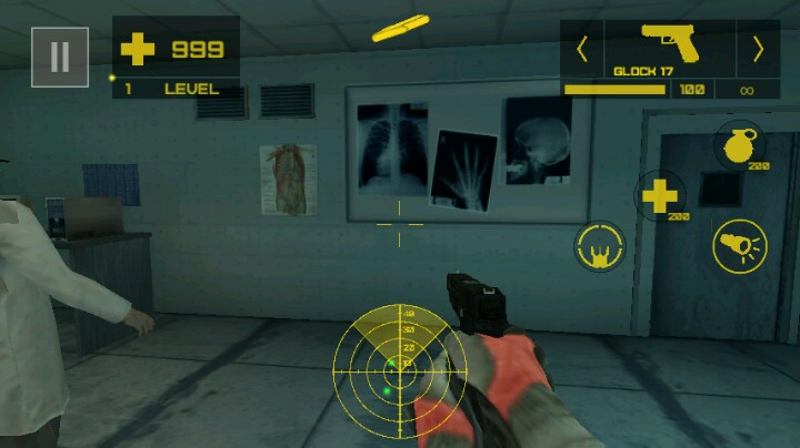 话说,一个生物地下实验室里,你举着一把手枪缓缓前行,在正下方的雷达测试仪提醒你到实验室去拿血包!