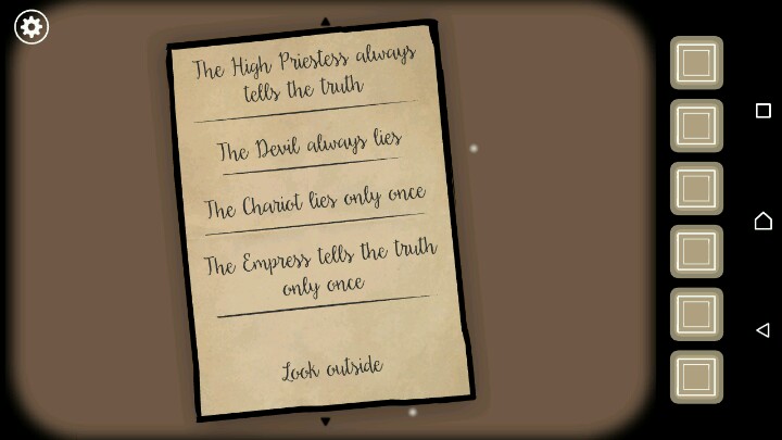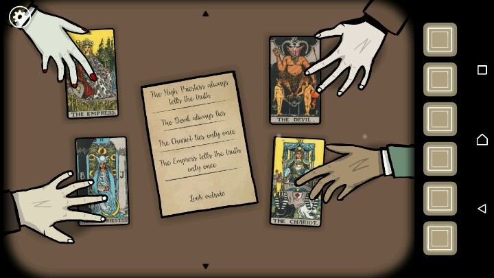 然后是塔罗牌与说谎者谜题,这是我相当喜欢的一个谜题,因为剧情树的时间轴是穿插的,所以需要玩家通过细节进行推理,由于我实在没找到如何设置中文所以就玩的原版,可能有笔误请谅解。首先谜面提到四张牌对应的四个人分别是全说谎、只有一次谎言、只有一次实话、全都是实话,那么咱们来看看四个人分别说了什么:Ida:1,密码后两位46(×)。2,报纸下面有钥匙(×)。3、恶魔口袋里有她的照片(√)Samuel:1,密码前两位37(√)。2,妹妹死了(√)。3,图右下有钥匙(√)。Albert:1,他不喜欢Ida,然而他随身携带她的照片(×)。2,哥哥未婚,然而墙上有婚纱照(×)。3,涂鸦右边有卡片,然而是左边(×)。Mary1,现在是秋天(×)。2,密码后两位是94(√)。3,图右上有钥匙(√)。所以对应塔罗牌答案如P2