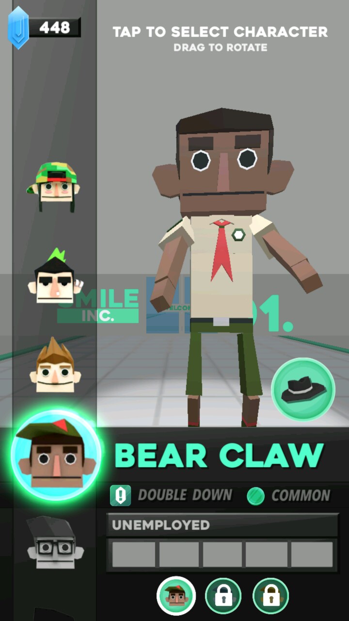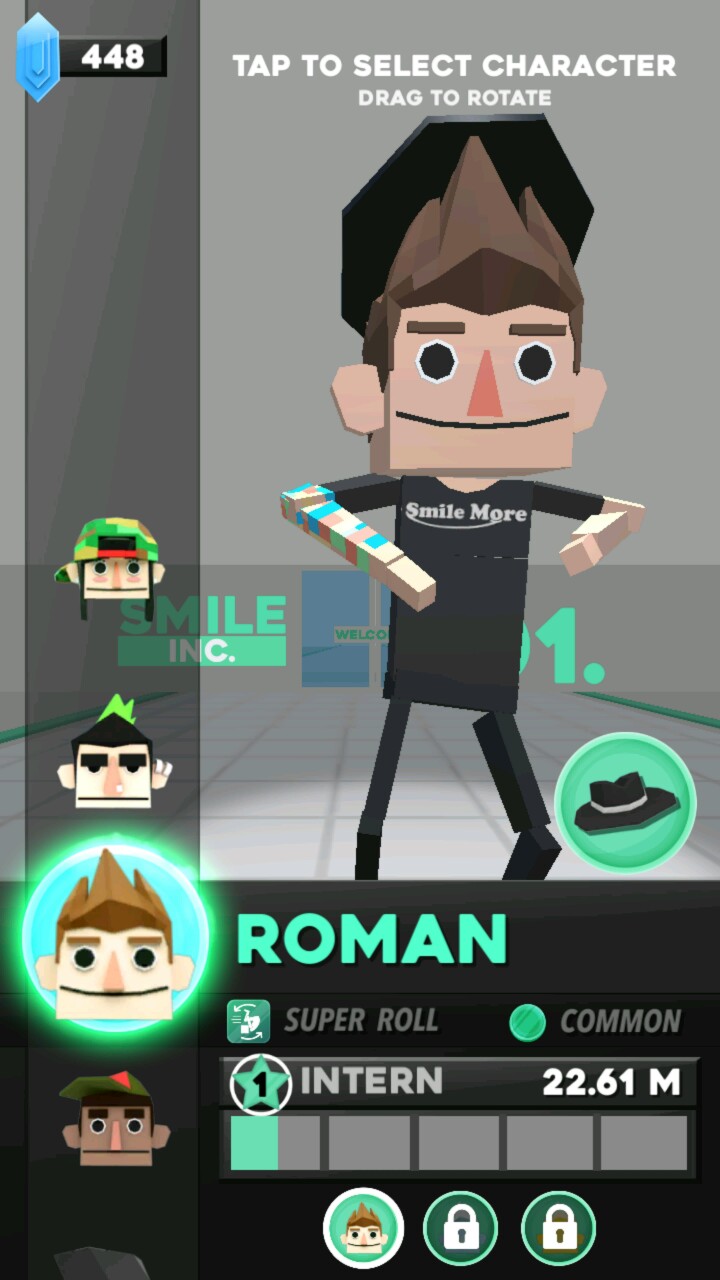 在评价游戏之前我想要带大家看一下设置,除了上面的音效音量和bgm(背景乐)音量,进入游戏右上角之后下面有这么四个选项,左上是是否关闭血腥模式,左下好像是省电模式还是什么电池保存???,右边可以选择不同的操作,右上是重力操作,右下是摇杆操作,以及进入游戏的跳跃可以靠单纯的点击屏幕任意处来进行,不必必须点中跳跃的图标。操作等小事宜就告一段落,接下来我们来讲游戏本体。首先游戏是个算较为特立独行的跑酷游戏,刚刚进入游戏除了舒缓而愉快钢琴曲就是一阵由锯齿高速旋转形成的轰鸣声,白色的地板,低建模的游戏人物,各种各样的限制和路人一样的大概是微笑公司的“同事”。路上充满了各种凶残而具有致命性的陷阱,喷涌而出的方块、高速旋转的锯齿,刺球,鲨鱼,甚至还有些无厘头的大剪刀,老鼠夹以及铅笔栅栏,断头台等等等等可以置玩家于死地的陷阱,我们要做的就是在这样凶险的环境中跑路,活命和收集金币,游戏中1000宝石才能开一个皮肤,这点显得稍微有些苛刻,其实不然,本游戏有成就系统,我们获得的每个成就都伴随着一个免费礼品(皮肤)的赠与或是一些奖励宝石。游戏手感来讲略微有些让人不适,但是适应之后在这充满陷阱的漫漫长路之中也能在其中找到不少乐趣。游戏内具有等级系统(虽然我没看出来有什么用),皮肤也分人物和帽子,虽然陷阱满地但是却有警示和范围的界定方便玩家闪躲,游戏中也自带短时间无敌快速跑的道具,咖啡杯,这让危险旅途中的玩家多多少少安心了几分,如此低建模却带给玩家不少新奇感和紧张刺激的游戏体验,实数跑酷游戏中不可多得的良作!