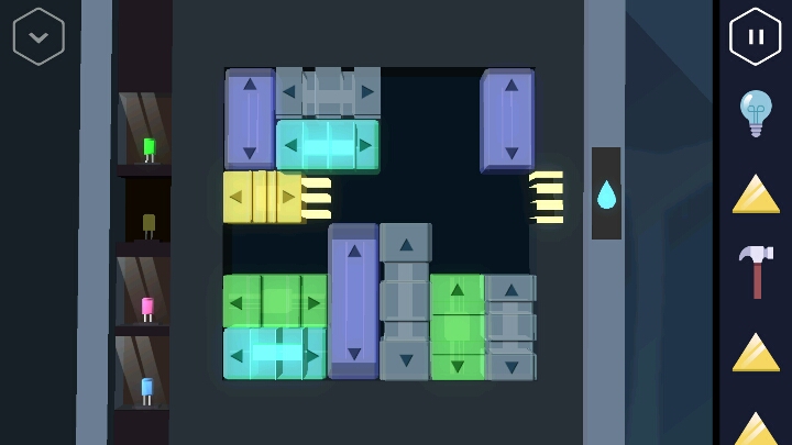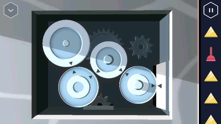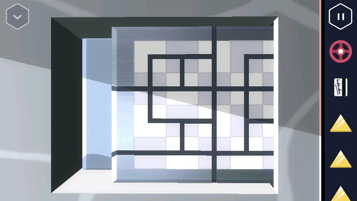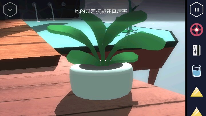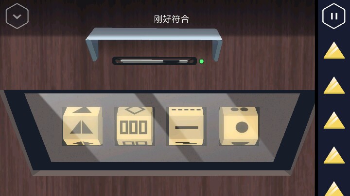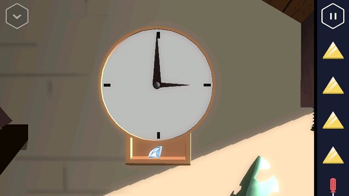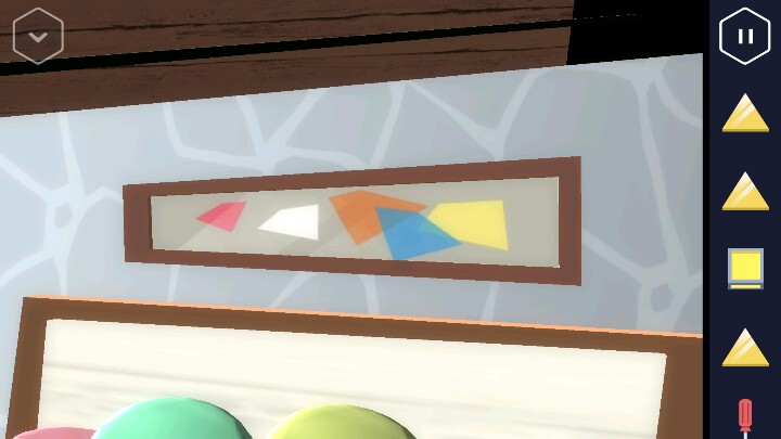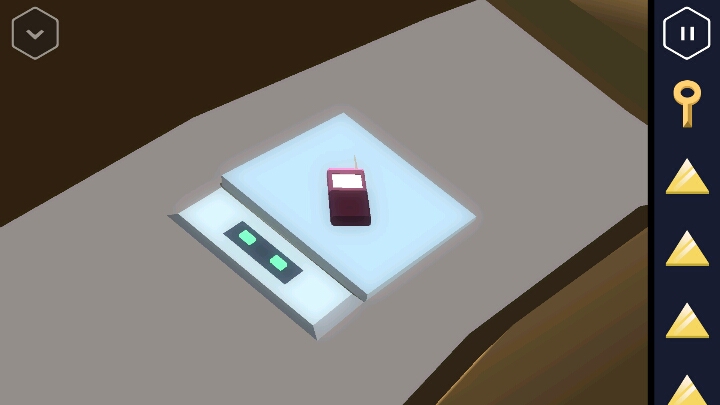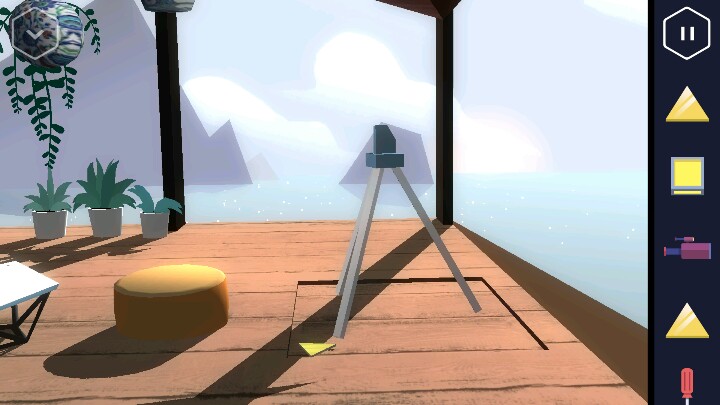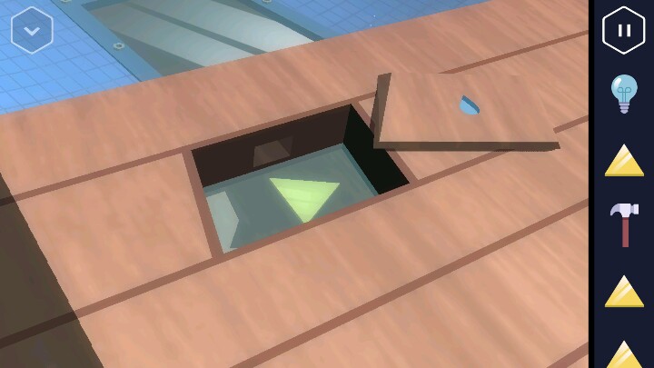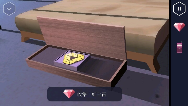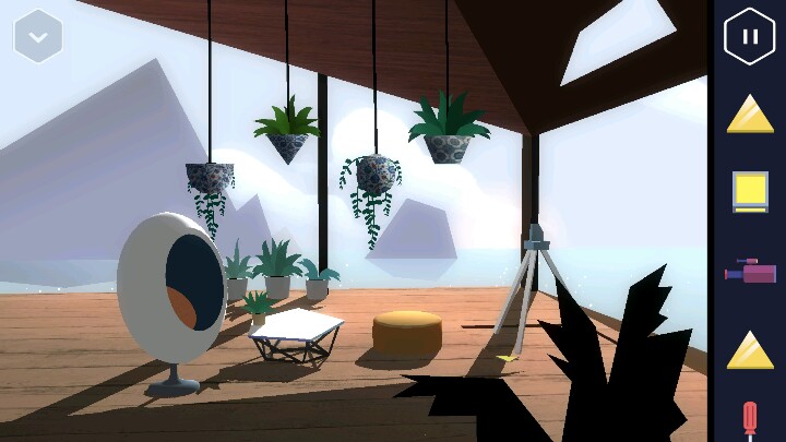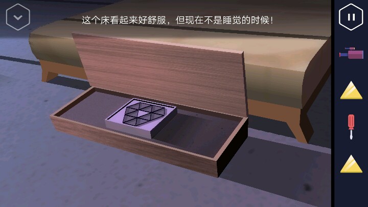 按动机关,变回浴室。接着回到走廊直走来到卧室,床尾有一个长方形的木盒。 打开后里面有一个装置,可以放入黄色三角,但现在数量不够。 接着从卧室的楼梯上去,点开椅子上的木板又找到一个三角。桌上点开花瓶还有一个方块。然后改变四个盆栽的位置,1、3在下,2、4在上进行调整。 然后就可以打开地上的暗格了,出现一个三角架,又得到一个三角。
