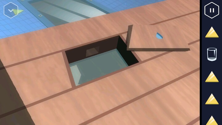 从阳台出来后发现泳池里有一个三角,但是水里有电。拿走圆桌上的杯子,椅子下也有一个三角。把地上的木板拿开,这里可以用杯子舀一杯水。有用。然后从旁边的楼梯下去,用力旋转取走水阀的阀门。(逆时针)旁边的盆栽里又找到一张卡。