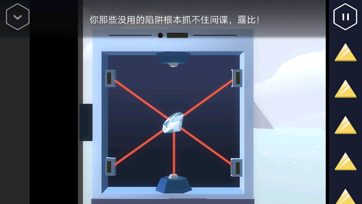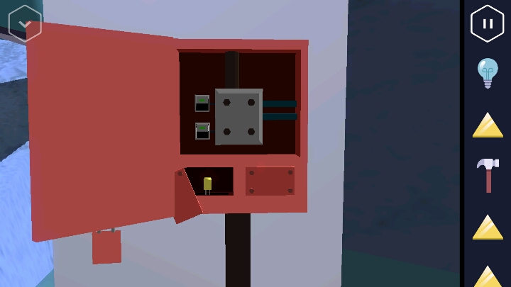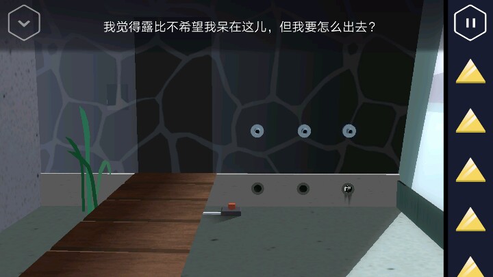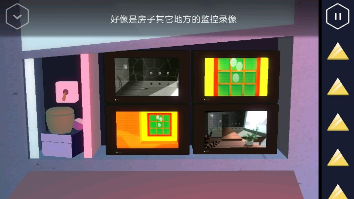 左边有一个小机关,点击后房间变成了监控室。 洗手池位置有一个粉色的圆筒可以获取。 点击中间四个监控屏幕会进入动画。出现了那个露比。 按动机关,变回浴室。接着回到走廊直走来到卧室,床尾有一个长方形的木盒。 打开后里面有一个装置,可以放入黄色三角,但现在数量不够。 接着从卧室的楼梯上去,点开椅子上的木板又找到一个三角。桌上点开花瓶还有一个方块。然后改变四个盆栽的位置,1、3在下,2、4在上进行调整。 然后就可以打开地上的暗格了,出现一个三角架,又得到一个三角。 然后把粉色圆筒装到三角架上,但似乎还缺少一个部件。下来后要记住床头这些图案的颜色和顺序,有用。 回到一开始的控制台。按上面记住的颜色,顺序摆放。又得一个三角。
