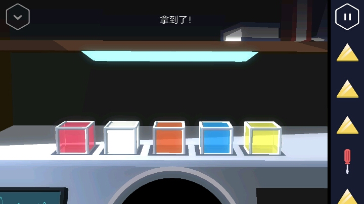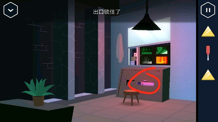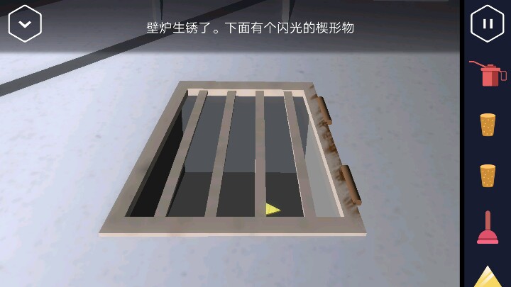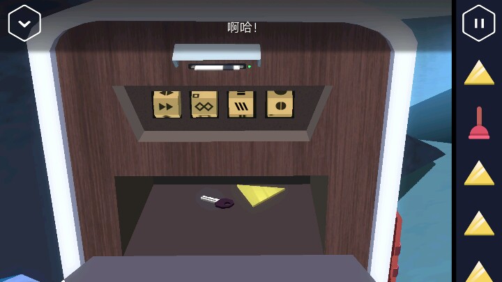 进入仓库,打开柜子以及桌面上可以获得两个软木塞和油壶,马桶搋子。把油壶倒入生锈的门上,打开后取走里面的黄色三角。出来后把软木塞塞进两个洞中。