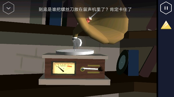 接着从这个楼梯上二楼,会有一堵门,用水缸里那把钥匙开门就行了。从走廊抽屉里可以得到一个零件。 然后进入左边的房间,在留声机旁找到一张黑胶唱片,放上去后再把把手插入,旋转到红色刻度区域。得到螺丝刀。点击桌面看到一张纸条。看来她是想搞事情(ಡωಡ)