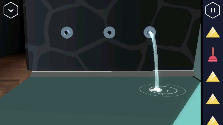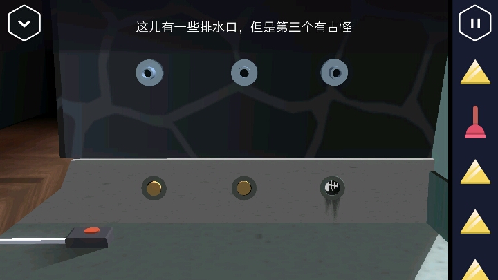 退回到房子外面,把刚刚拧下来的阀门装到这个水阀上。(顺时针)旁边还有个箱子,把刚才得到的卡放进去。回到泳池下面的这个水池,发现水流干了,出现一个红色按钮,按下红色按钮。出现机关,又得三角。 然后回到浴室打开机关切换到监控室状态,有一个屏幕会出现指纹,记录下指纹所在的位置和数量。来到水池旁,中间那排按钮的第一个按两下,第二个按一下就可解开机关。 进入仓库,打开柜子以及桌面上可以获得两个软木塞和油壶,马桶搋子。把油壶倒入生锈的门上,打开后取走里面的黄色三角。出来后把软木塞塞进两个洞中。 然后到房子外的那个水阀重新打开阀门让水流通,再回到这里第三个洞的鱼骨头就会被冲出来,拿走。