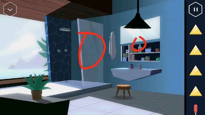 然后进入二楼的右边房间,是一间浴室,在洗手池上面打开玻璃门。又可以找到一个三角零件。此时打开莲蓬头留意墙上有一个淡淡的时间。旁边瓶子上有三斜杠图案,后面都会用到。