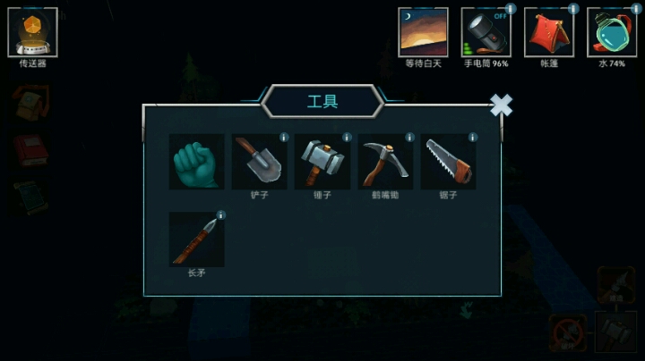 后期得到手电筒,就可走夜路了!点击右下角那个使用工具的图案后,在屏幕左上角有个传送阵图案,可传送于最初飞船降落的地点哦!