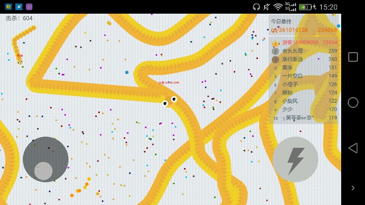 第一,作为最能吃的代言!!!我要告诉大家,当新手上时,觉得最悲哀的就是。。抢时根本抢不到啊!!!!!!!人家又快又熟练,指不定啊呜一口就把你给吞掉了!你躲得开吗?所以,为了吃,如果是长一点儿的话就把一堆15包主尽情享用!!长一点儿的,别人可不敢碰!贪吃蛇呢,是碰到比自己大的蛇或者是头对头或是头对尾,碰到之后都会死翘翘o(╯□╰)o短一点儿的,还是算了吧,先找些小的,单个的,比较容易吃。