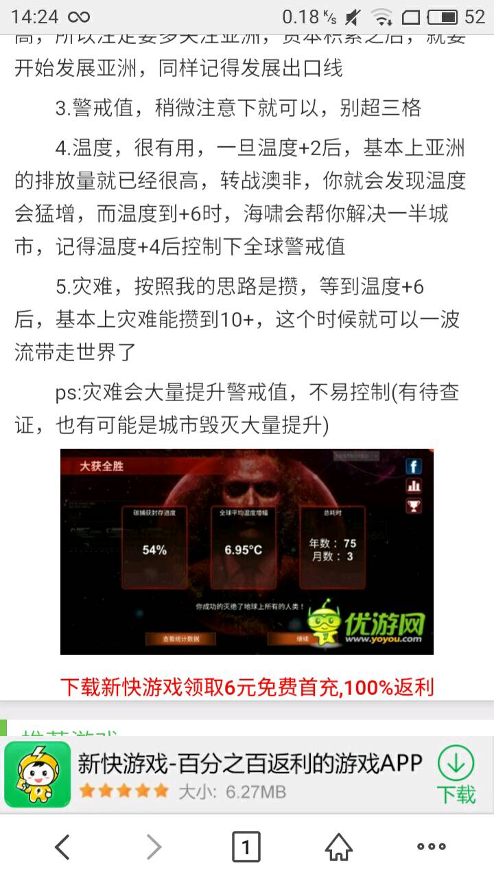 4.温度,很有用,一旦温度+2后,基本上亚洲的排放量就已经很高,转战澳非,你就会发现温度会猛增,而温度到+6时,海啸会帮你解决一半城市,记得温度+4后控制下全球警戒值