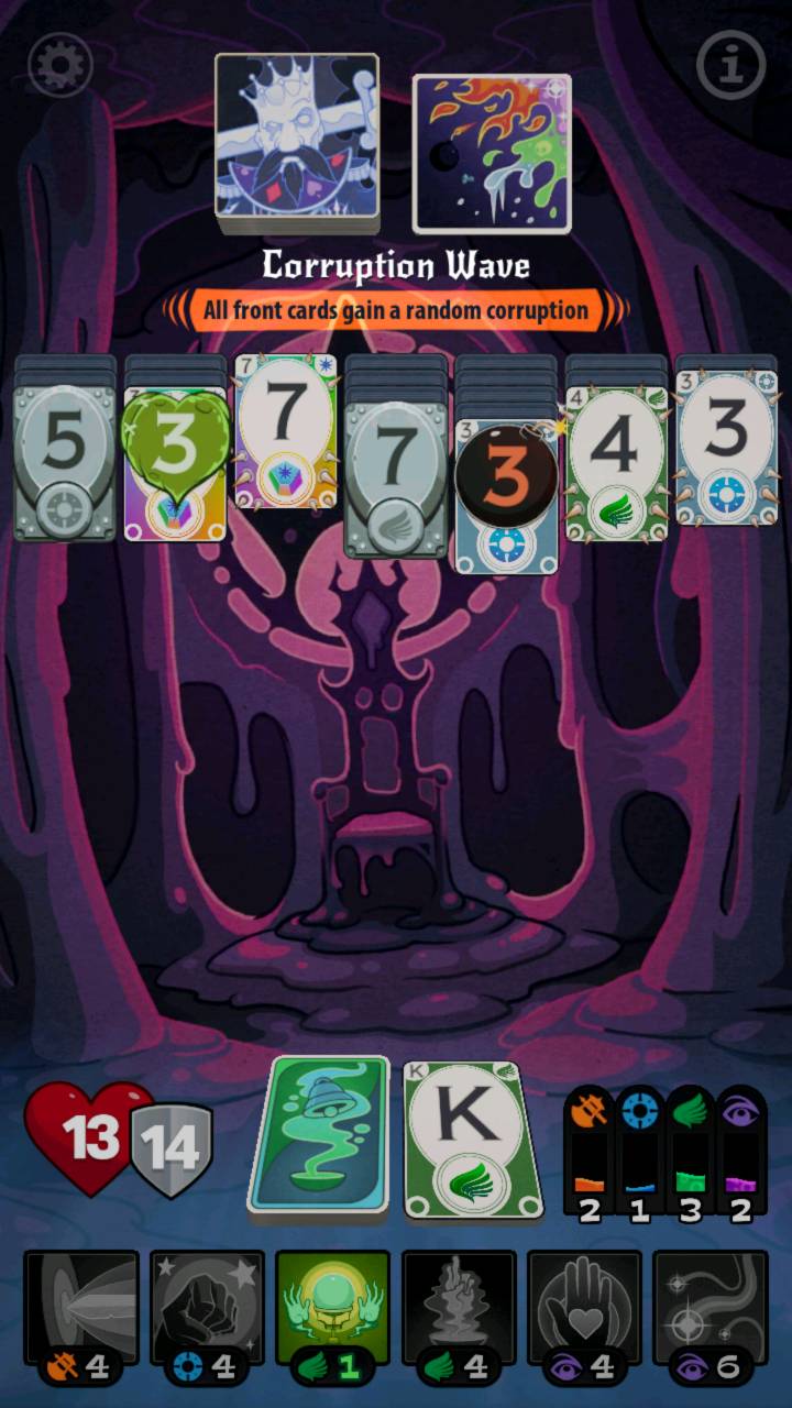说是空当接龙,其也就是类似,实际是手中的牌和上面的牌数字/字母靠近就可以消掉然后拿到手中,四个牌色可以获得相应技能值,每关前可以买新技能,然后搭配用。比较棒的设计每个boss有不同的招数,不确定性虽然很大但是基本玩上几次就能有点把握,以备下次玩带对技能。玩法很创新(大概),艺术风格相当不错,就是其它职业需要完整版才能玩(不是大事吧?)休闲游戏也算得上,不过眼力不好的估计一局要玩上挺久(比如我(;´Д`))