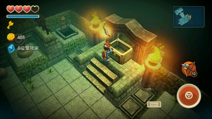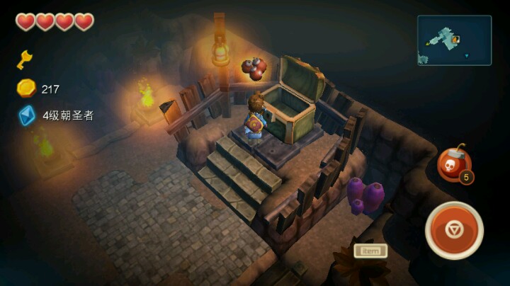 之后,按提示到了矿洞,在底层,有四个未点燃的火柱〔图4〕,需要点燃,会出现一个宝箱,里面有黄金(万能)钥匙,打开黄金之门,就能获得炸弹了〔图5〕!