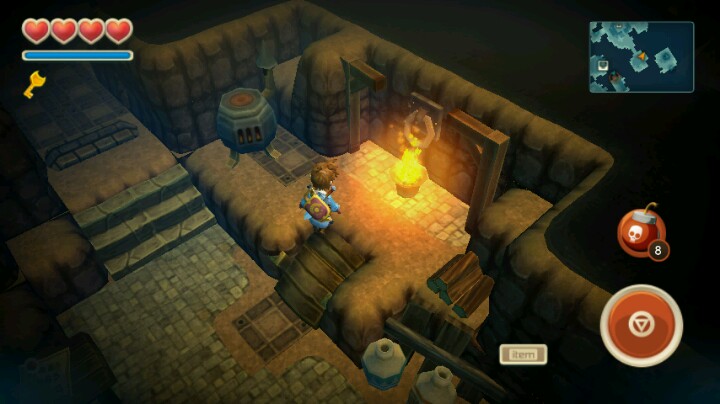 之后,按提示到了矿洞,在底层,有四个未点燃的火柱〔图4〕,需要点燃,会出现一个宝箱,里面有黄金(万能)钥匙,打开黄金之门,就能获得炸弹了〔图5〕!