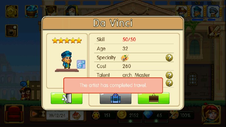 教程会送五星级达芬奇所以一开始还是不用太担心啦,到后面搬到第三个城市之后就要开始考虑招募第三个人了,最好是攒够一万然后招个四星半的,星级越多学习速度越快,学习速度快了技能点就增加的越快,技能点越多制作艺术品时速度就越快,所以宁可紧张点凑够钱,也一定要招个好一点的人。还有一个小贴士:把技能点较高的人放在技能点较低的人旁边会有利于技能点较低的人学习哦,而且可以两个高的中间夹一个低的,学习速度会更快;也可以两个低的中间夹一个高的,两个人可以同时学习哦然后后期有一个头上顶着信封的人来,他是送报纸的,会告诉你一些当下的时事啦~当然跟我们基本上是没什么关系的,不过会有很多熟悉的历史事件比如郑和下西洋啊,各个国家的王位更替啊,中国的清王朝被推翻啊,牛顿通过苹果发现地心引力啊之类的,很有意思的差不多就这样了,如果还有的话想起来再说吧