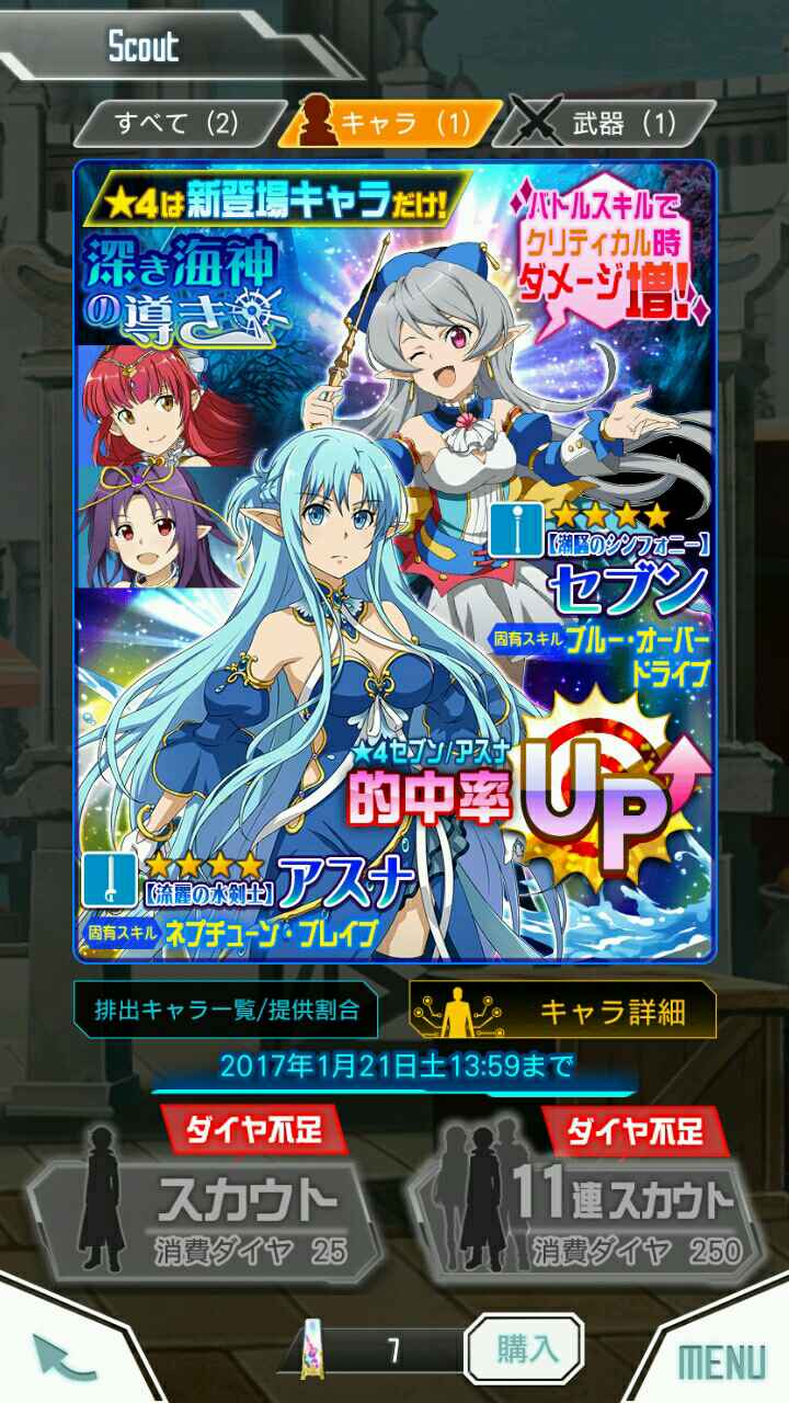 之前提的抽卡活动,看到亚丝娜女神我就攒点那个不知道叫什么的货币单抽了两次……什么鬼啊,我能把他们买了吗…概率感人(非洲脸)不过活动上的角色可以体验模拟战斗(就是试用啦)还能抽武器,抽个人一次25,抽个武器一次15,而且凭我非洲脸单抽…抽出来的都是辣鸡…伤心╮( ̄▽ ̄")╭ 接着慢慢攒钱抽,总有一天能抽个女神吧(画十字许愿)
