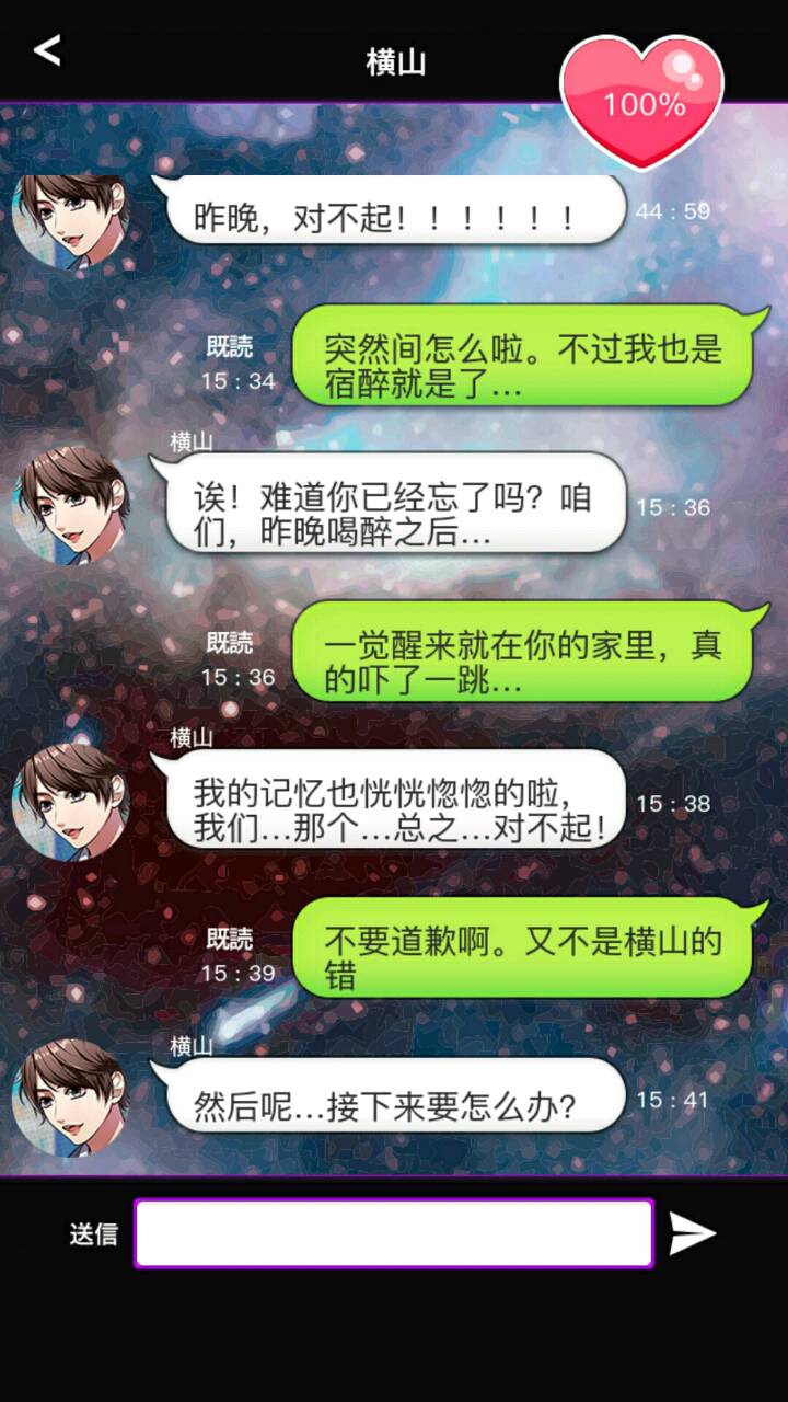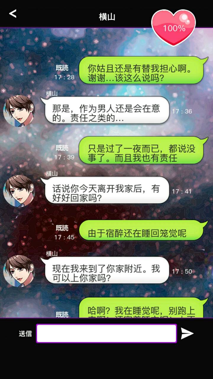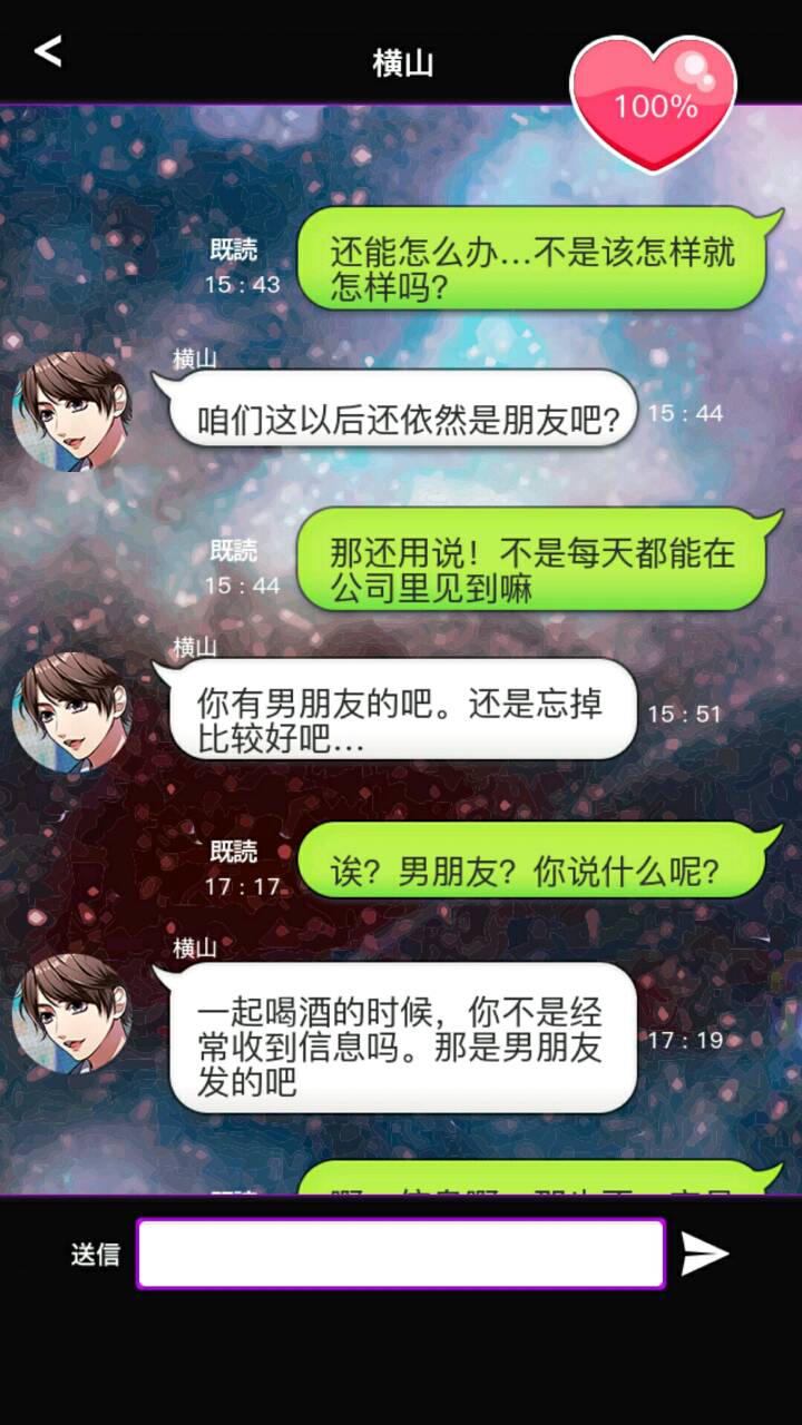 首先终于成功打通游戏了,等最后三个人出现等了很久,最后怒把手机时间调快一年(。)奇迹出现,所有人物解锁。看完所有短信之后再综合游戏信息-约摸攻略男生线用的是绘里,而女生线是横山。以及正牌男友最后这句话是怎么回事?什么累了的话随时都可以到我这里来,仿佛潜台词是:无论你和多少男人有过纠缠,我都会原谅你接受你。真真一个圣父,唏嘘。裕树和里奈真的绿油油(。)不过一旦接受了这种设定之后,看着横山和绘里的聊天记录反而觉得他俩挺配的是怎么回事!还我正常cp观啊喂!