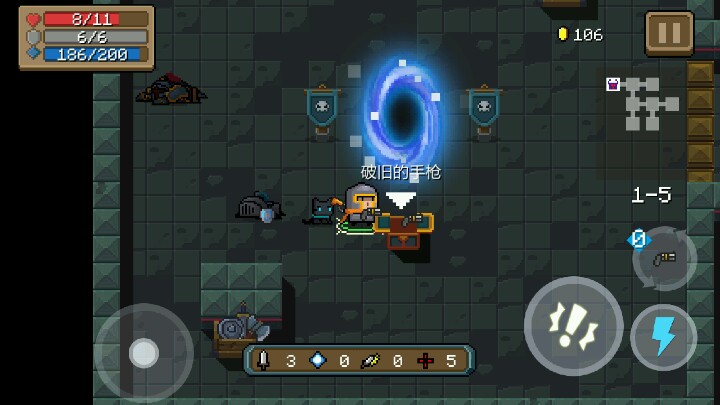 2.在有大骑士的那个屋子里,用之前一个门里的技能,叫加宽激光武器的宽度,用随便一把激光枪,借助屋子左下角的两个方块。刚好能挡住大骑士的剑波,它有两种攻击方式,一是向外射一个球,如果接触到墙就会反弹。或者是很多小三角,如。果是小三角的话,就会攻击到你三滴血。