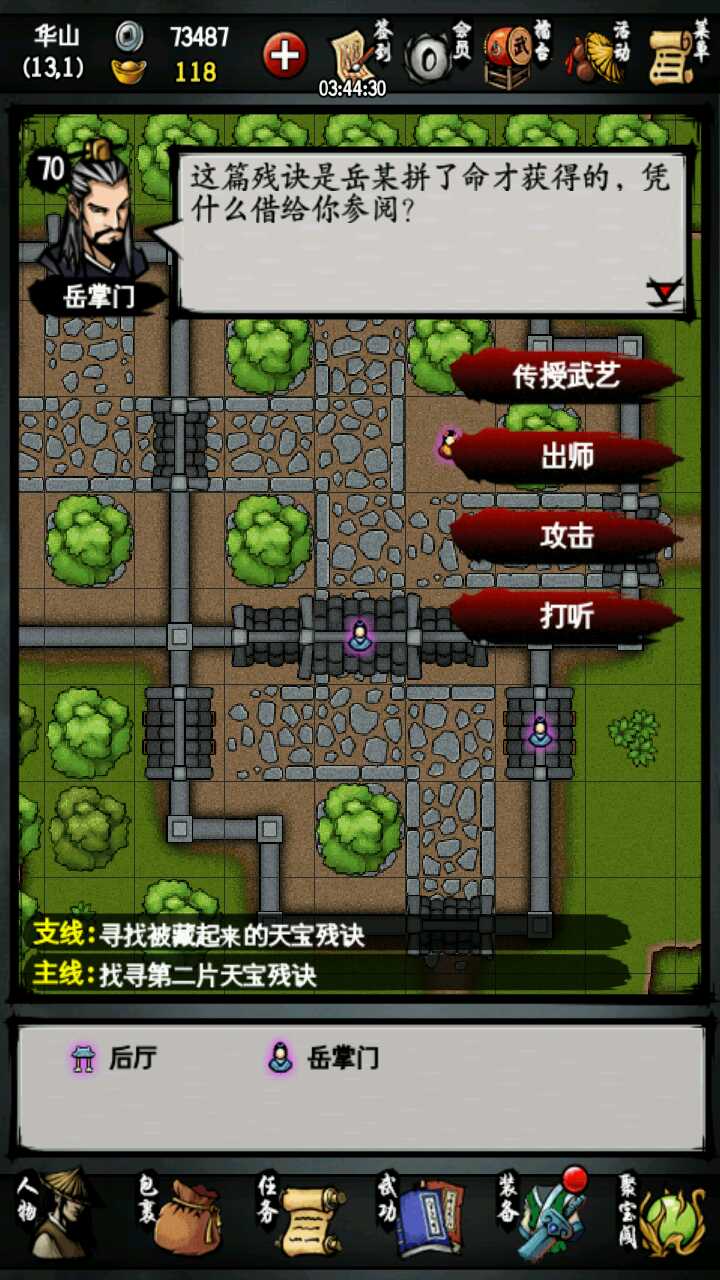 下面说下到洛阳之后,先说拜师,剑主自然第一个拜华山,但是先去嵩山拜门五次激活支钱任务(这个支线只有无门无派才能激活,前期就不要完成了,留着有多余资源再完成)然后拜入华山接入任务,尽量全接小师妹任务,小师妹只会到处跑几次,后面就不会了(后面就不用一直看着小师妹了,可以去挖矿,等级够了可以打怪,也可以读正气决,至于怎么全接同一个任务就去官方群里问吧,应用汇不让说。)小师妹获得贡献25两天可以学剑掌,华山剑法第一个不用学,去华山山下打听老太太的鸡完成支线送一本,给苏。剑掌学习之后不推荐带剑掌。具体后面说,学完剑掌之后学好华山心经给柳如意学习,之后退出华山。去那个门派看个人爱好。(记得每四个小时去杂货铺买一个文房四宝学习五狱剑法第一A剑,一共需要5个文房四宝和一个火把,能打过洛阳左上角的最后那个怪之后记得去刷洛阳右下角的玄虚刀客和华山山下的项啥来着那个,他俩掉落残页,如果有时间也可以去金刀门刷金元元霸,也就是金刀门的金老爷子)下面说退出华山之后,可以去少林也可以去太乙,各有各的好处,少林拳法强,而且还有两个99木材可以砍,少林的衣服平民最好的可以批量的衣服,少林扫地任务可以获得横练功法(退出少林之后依然可以去砍,横练功法胡休专属)太乙刀法强,有无相刀。无论拜入那个首先把佛法正气道学最少弄到200