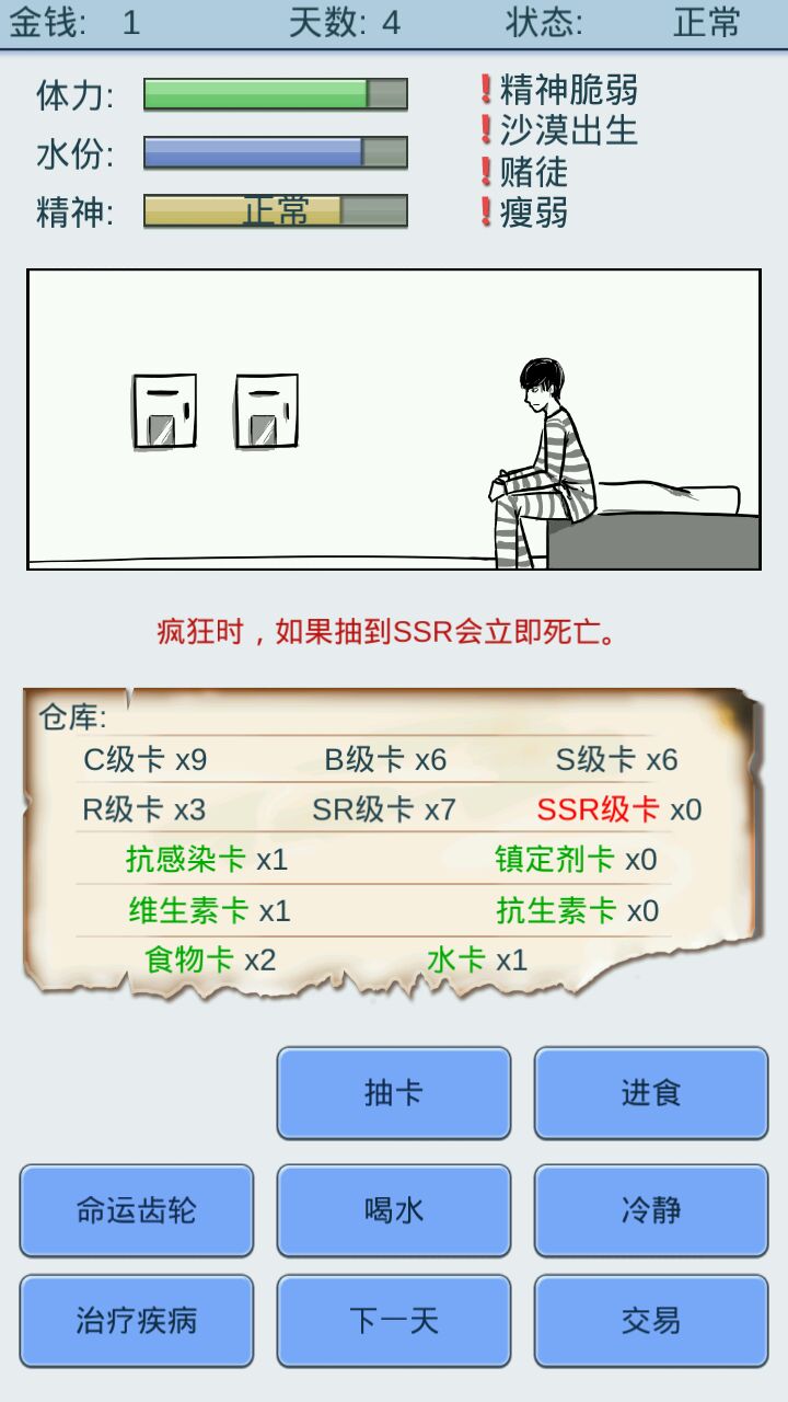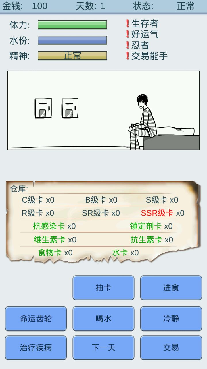 玩了无数场,终于通关了。以下是一些心得:1.命运齿轮。命运齿轮可以先升两个SSR几率的,然后需要的点数太多,就不用去管了。其次升食物和水,这是为了前期你有足够的水喝食物吃。最后升生存类药物,这是为了后期你有足够的药物卡可以换钱抽卡。2.食物卡和水卡的利用。从游戏开始就尽量保持食物槽和水槽满格(基本上一天一水一食,过一段时间偶尔会用两次),并且多下来的卡不要急着卖掉,以应对后期可能出现的情况。3.镇静剂。非常重要的道具,在后期会体现出来。后期为了抽SSR,会大量卖出卡,这时候镇静剂就起大作用了,因此在交易中看到有适合价格的镇静剂卡就赶紧买。4.其余生存类卡。保证每类卡起码拥有3-5个或以上。后期这种卡存的越多越好,在交易中卖出,来换钱继续抽卡。5.一年时间的合理运用。前200多天只要保证自己在能生存的情况下抽卡,SSR的多少无所谓(本人前两白天只抽到了38个SSR),后期食物和水应该挺多了,就不用担心饿死渴死了,甚至可以把多的食物卡水卡来卖。6.人物的特点。右上方4个感叹号后面的就是人物特点。这个也很重要,归纳起来,"贪婪"在后期是有用的,但是前期不要多用,不然没有镇静剂很快就会疯狂。"生存者"和"忍者"是最好的搭档,"交易能手"也会体现在后期。"精神强大"倒是没多少感受,"喜欢药物""喜欢食物"也是挺有用的,但相对于上面的比较次要。"赌徒"和"商人"除非是老手玩家,否则也没有太大作用。所以刚开局人品弱鸡那么一些些的可以多刷几次,尽量刷到好的。7.耐心。有时候抽很久都抽不到SSR,这是很正常的,不要心急,遇到这样的情况反而是在帮你收集其他卡来换更好的卡或钱。大致就是这样啦,希望大家收益!求汇汇上墙~