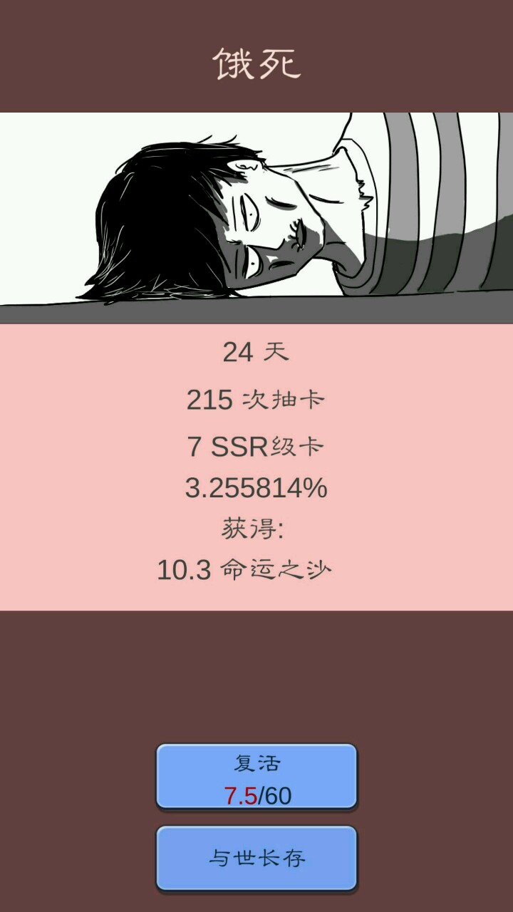 5.一年时间的合理运用。前200多天只要保证自己在能生存的情况下抽卡,SSR的多少无所谓(本人前两白天只抽到了38个SSR),后期食物和水应该挺多了,就不用担心饿死渴死了,甚至可以把多的食物卡水卡来卖。