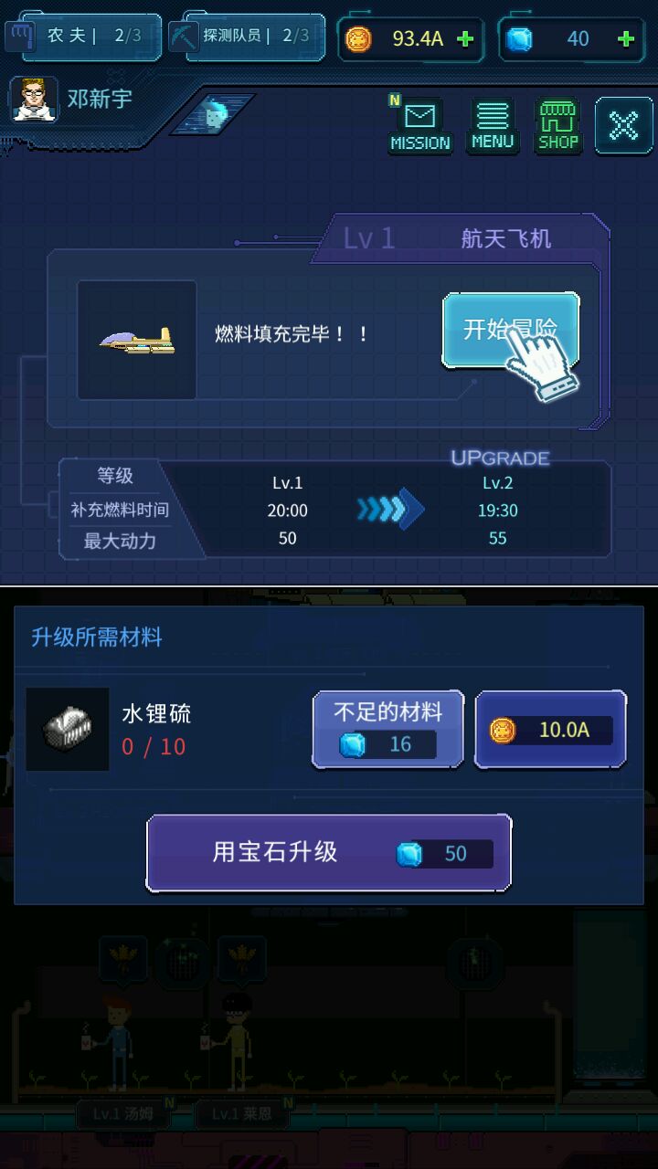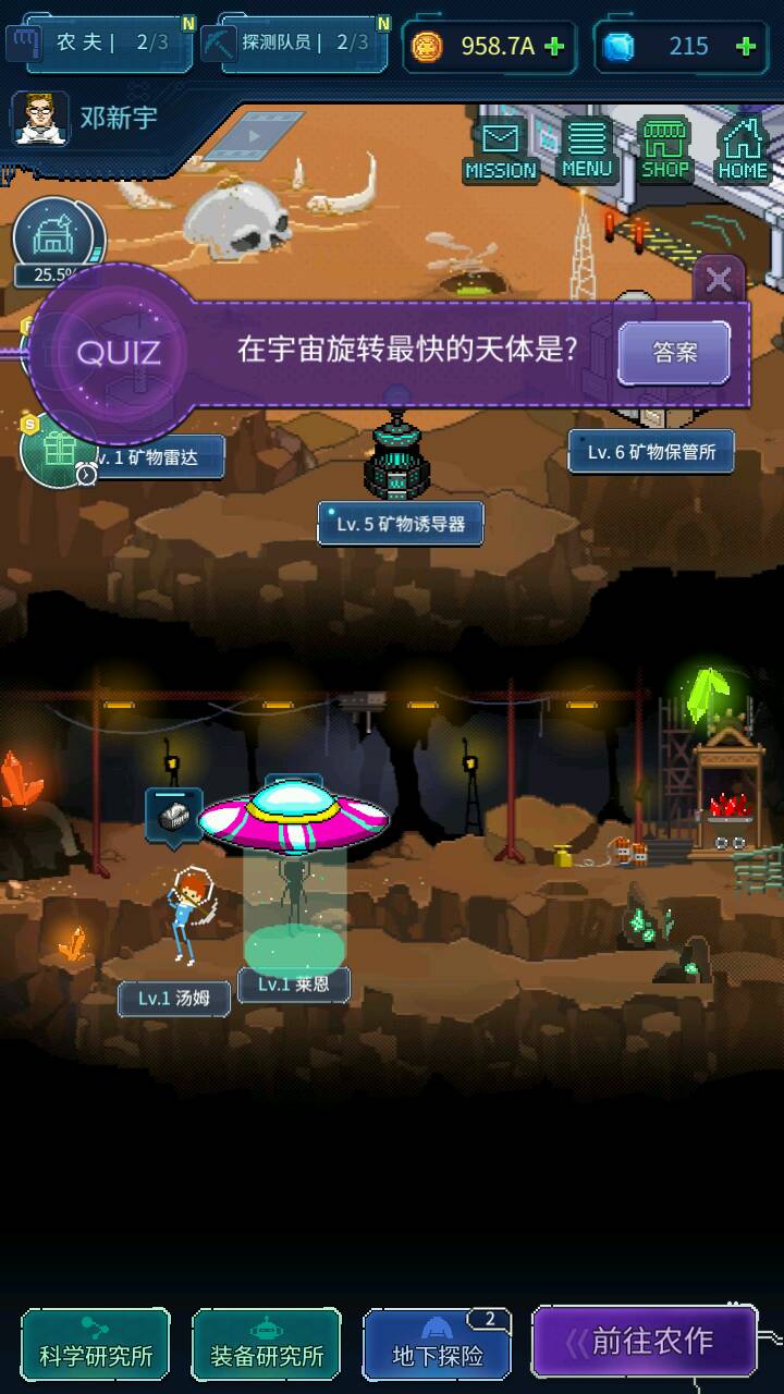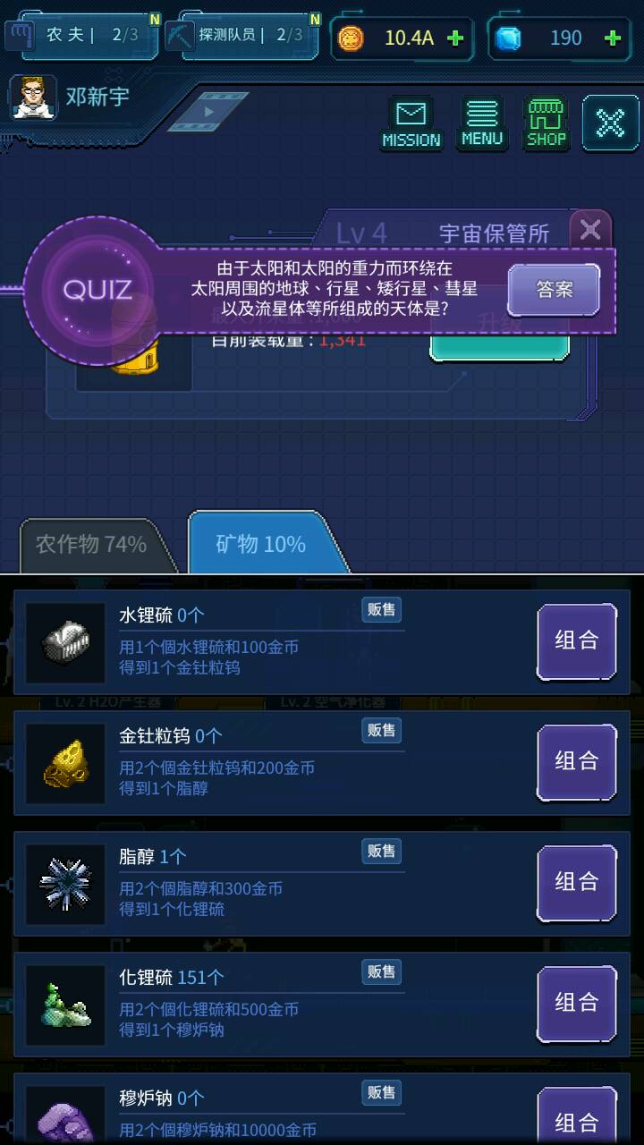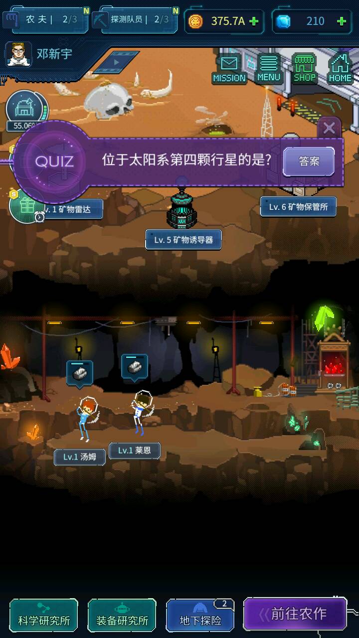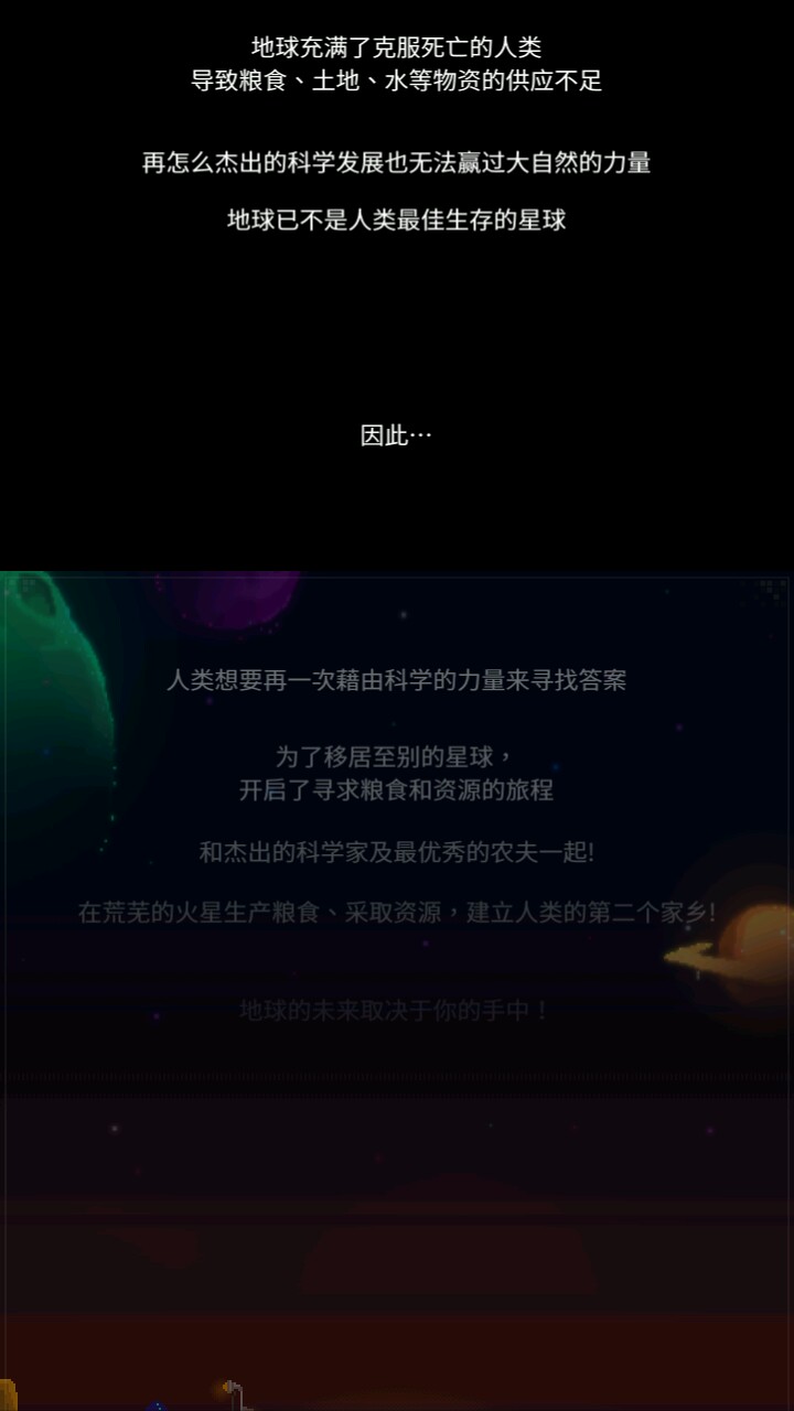 游戏是讲2060年的故事(看截图):大概就是讲地球人上网游戏,谜片成瘾,失去语言,在月球和火星设置太空基地,2040年人类可以再生移植,人类不再死去。2045年人类患上了抑郁症,并发现了外星人。2060年,人类克服死亡,导致食物不足,地球不适合人类居住,因此...(人类准备在火星生产粮食)游戏正式开始!在外星生活,任务很简单,就是持久发展,刚开始玩我有点晕,因为是像素的。仓库满了,挖矿工和农民就不干活了,要把仓库东西卖出去,比较烦,因为要一直不停的卖卖卖。但都是这样过来的。他们生产速度很快,所以我就把所有东西都卖了。只能雇佣三个农夫,最后雇贵一点的,反正有钱任性!把仓库升到2级就可以出去探险了!游戏玩法就像是节奏大师?我觉得很像,然后可以在探险里面获得很多道具,像什么药草,药草在装备实验室很有用的,后期有用!挖矿得到水锂硫,可以合成为金du粒钨(名字太难打了,找不到,所以就用拼音代替!),然后用这个合成其他的(脂醇,化锂硫,什么的名字很难打,看截图)升级了三级仓库,有个新功能就是地下探险,也能获得药草。游戏还有一个很有趣的地方就是有宇宙猜谜,对于愚蠢的我就一个都答不对,那么我就来问问大家:【图】总之很小清新,适合各位汇员玩,我就只说这么多吧!我截了好多好多图,大家可以在底下的楼层慢慢看。