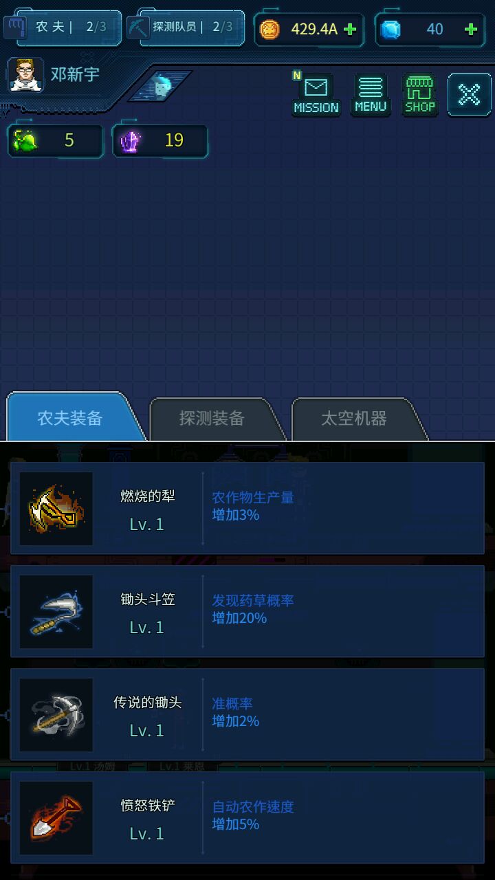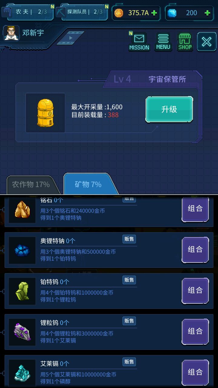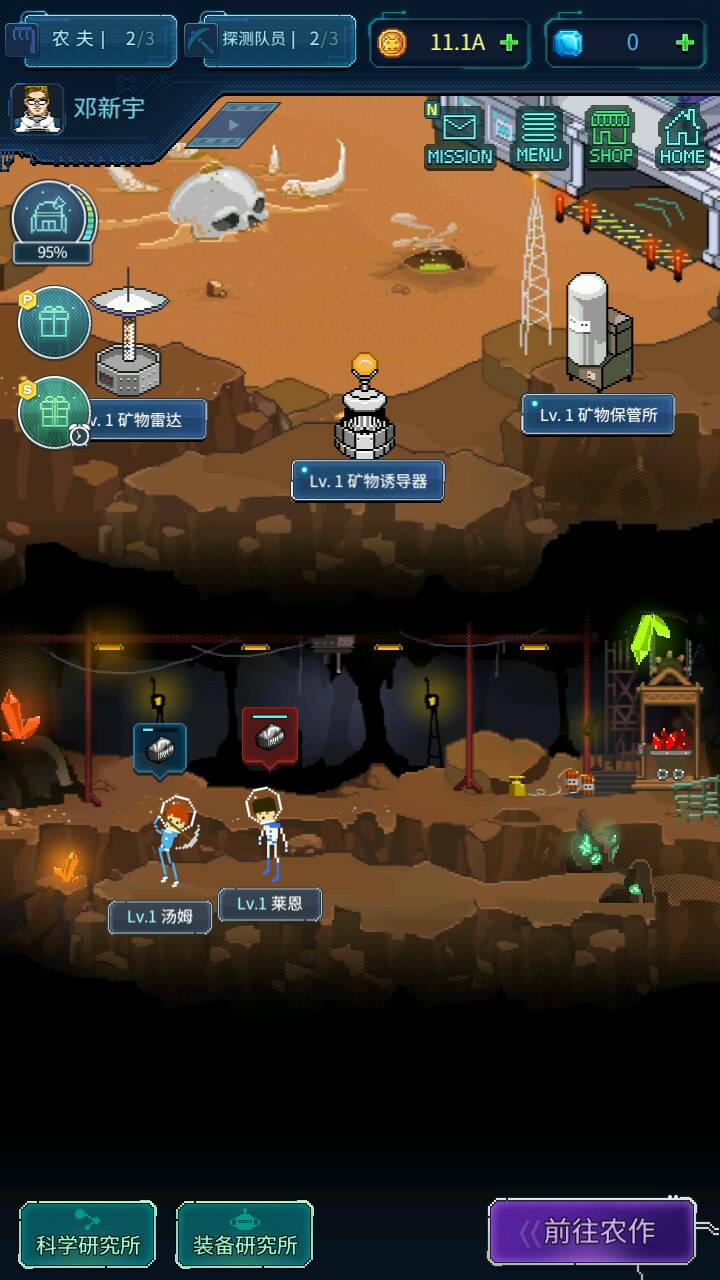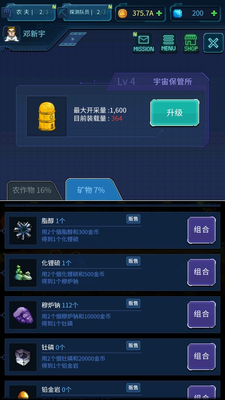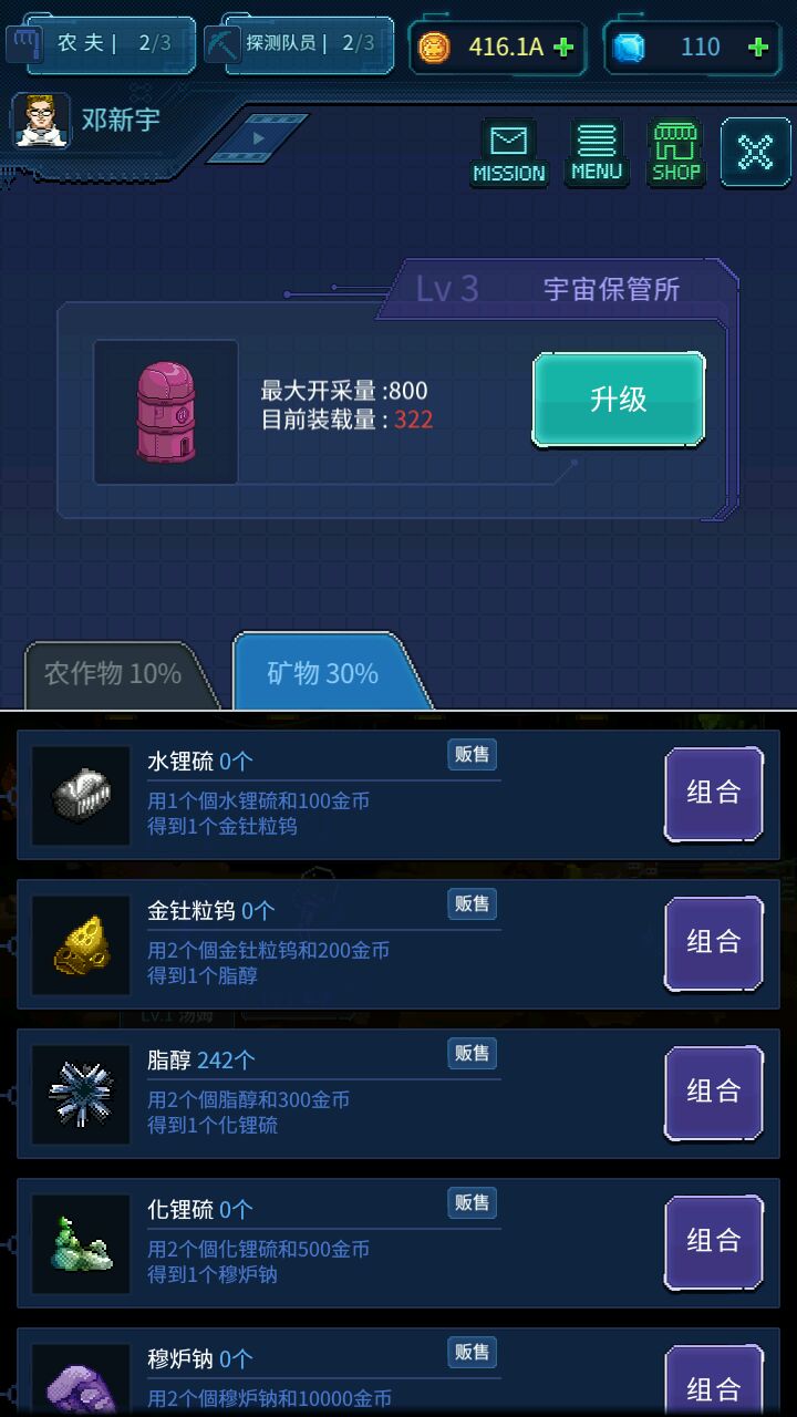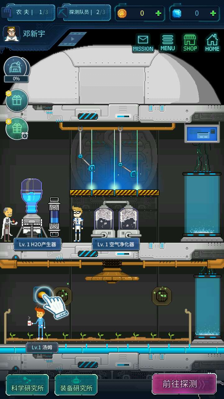 游戏是讲2060年的故事(看截图):大概就是讲地球人上网游戏,谜片成瘾,失去语言,在月球和火星设置太空基地,2040年人类可以再生移植,人类不再死去。2045年人类患上了抑郁症,并发现了外星人。2060年,人类克服死亡,导致食物不足,地球不适合人类居住,因此...(人类准备在火星生产粮食)游戏正式开始!在外星生活,任务很简单,就是持久发展,刚开始玩我有点晕,因为是像素的。仓库满了,挖矿工和农民就不干活了,要把仓库东西卖出去,比较烦,因为要一直不停的卖卖卖。但都是这样过来的。他们生产速度很快,所以我就把所有东西都卖了。只能雇佣三个农夫,最后雇贵一点的,反正有钱任性!把仓库升到2级就可以出去探险了!游戏玩法就像是节奏大师?我觉得很像,然后可以在探险里面获得很多道具,像什么药草,药草在装备实验室很有用的,后期有用!挖矿得到水锂硫,可以合成为金du粒钨(名字太难打了,找不到,所以就用拼音代替!),然后用这个合成其他的(脂醇,化锂硫,什么的名字很难打,看截图)升级了三级仓库,有个新功能就是地下探险,也能获得药草。游戏还有一个很有趣的地方就是有宇宙猜谜,对于愚蠢的我就一个都答不对,那么我就来问问大家:【图】总之很小清新,适合各位汇员玩,我就只说这么多吧!我截了好多好多图,大家可以在底下的楼层慢慢看。