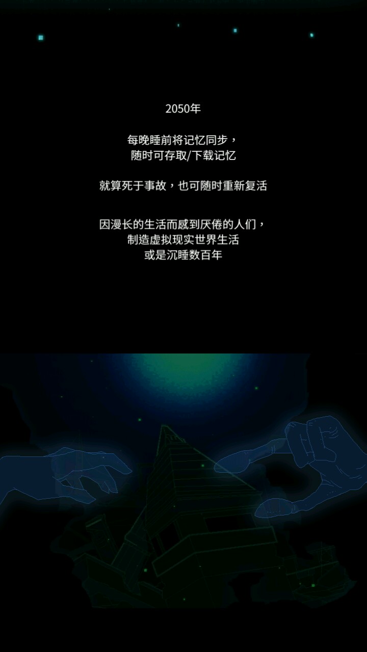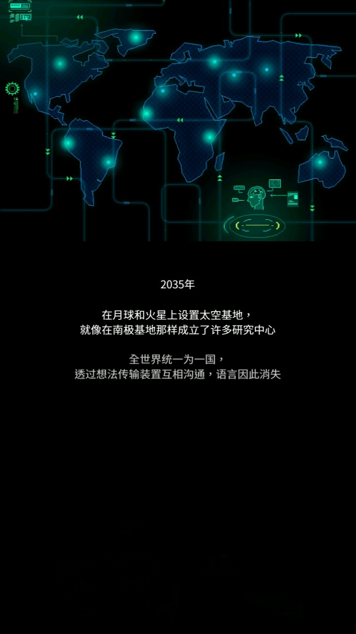 大概就是讲地球人上网游戏,谜片成瘾,失去语言,在月球和火星设置太空基地,2040年人类可以再生移植,人类不再死去。2045年人类患上了抑郁症,并发现了外星人。2060年,人类克服死亡,导致食物不足,地球不适合人类居住,因此...(人类准备在火星生产粮食)