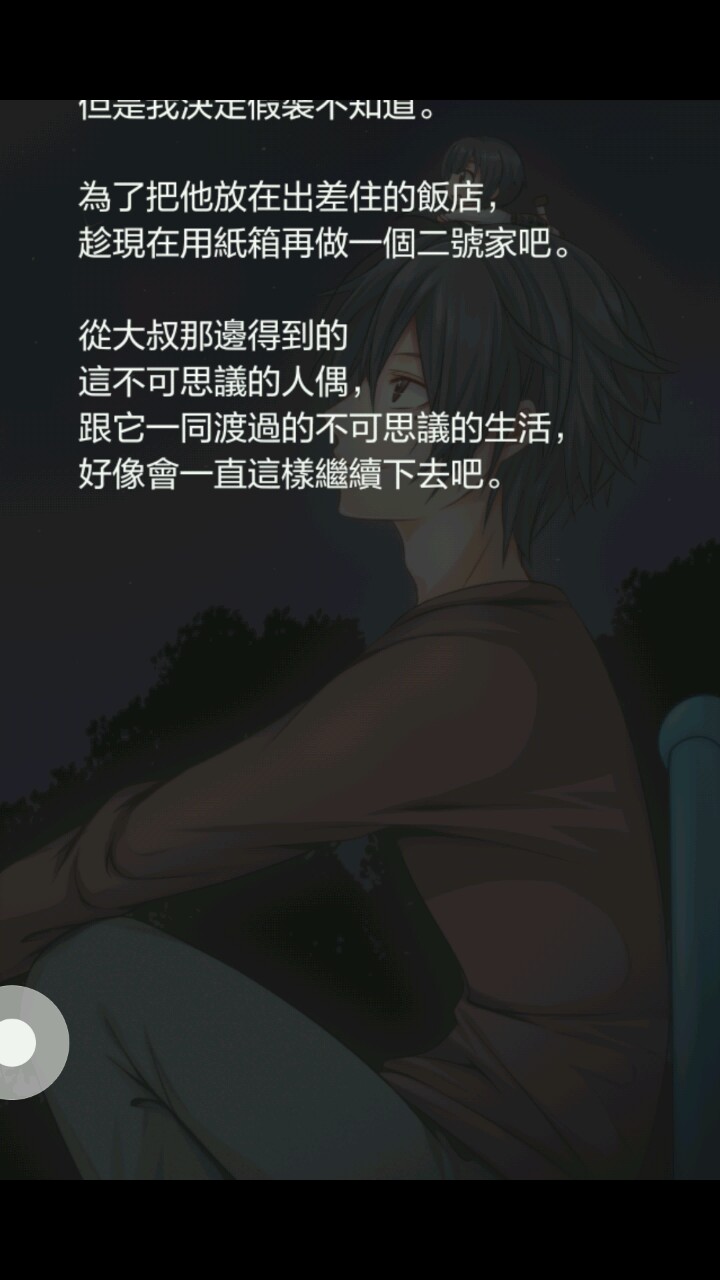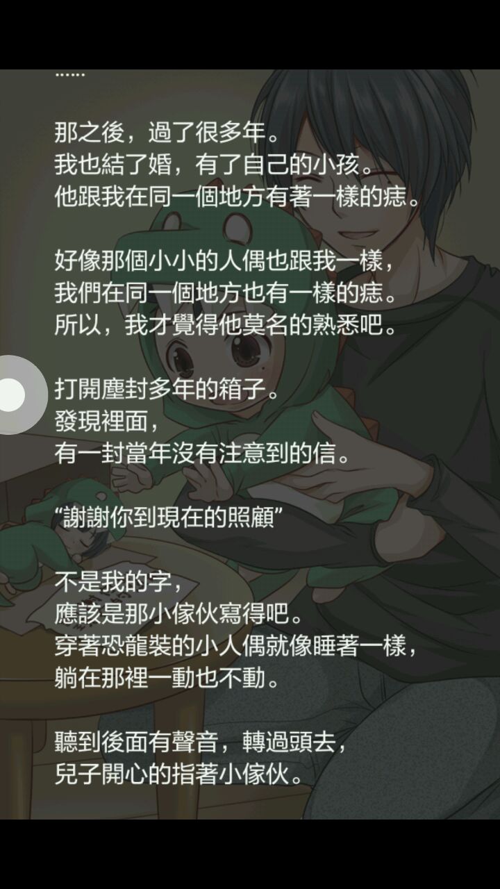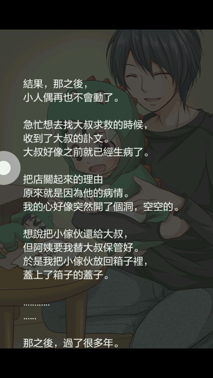 故事最开始主角小时候常去的玩具店大叔送了他一个玩偶,我最开始以为是乙女类放置play,后来发现主角是位小哥哥,我又以为应该是bl游戏,玩通关了才知道是个跟昭和店差不多的温情游,小玩偶还挺萌的。