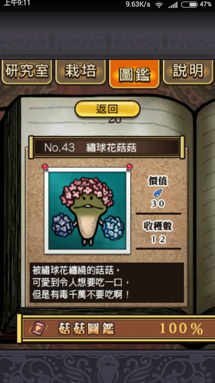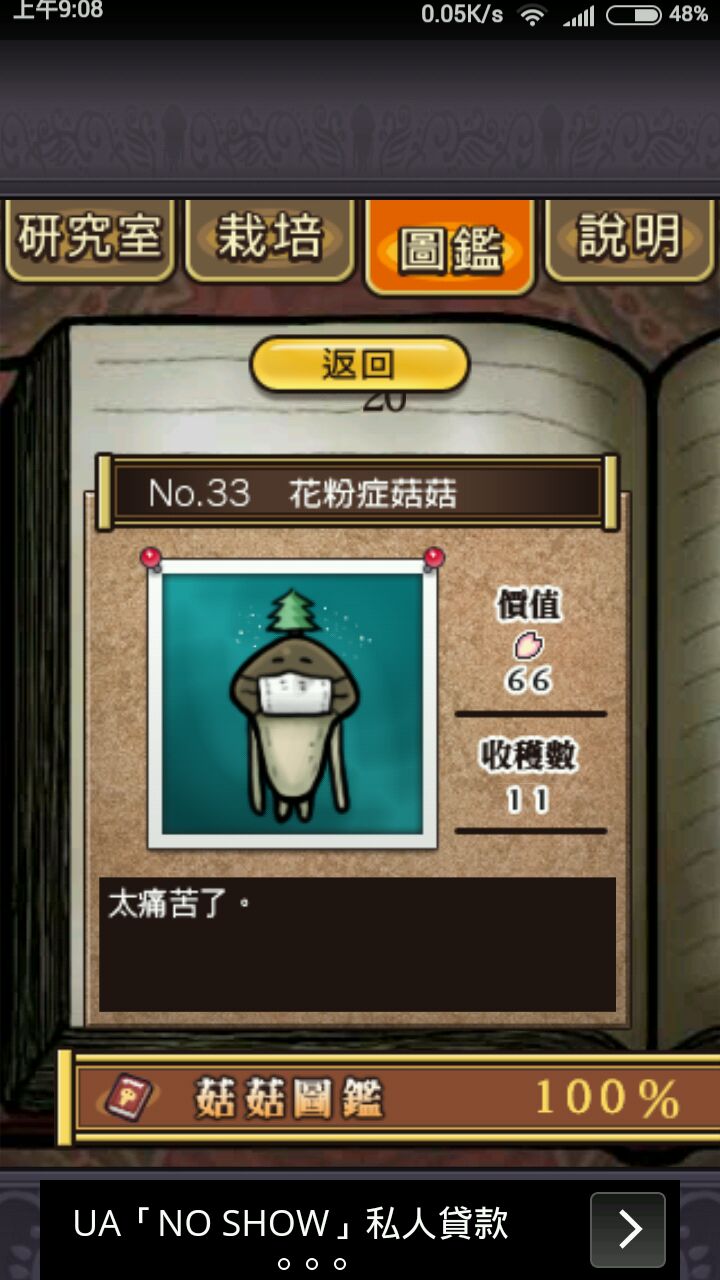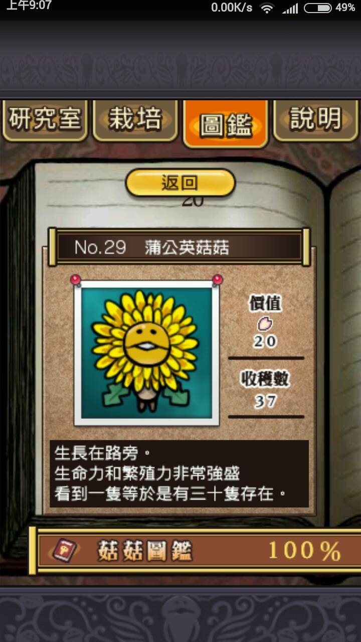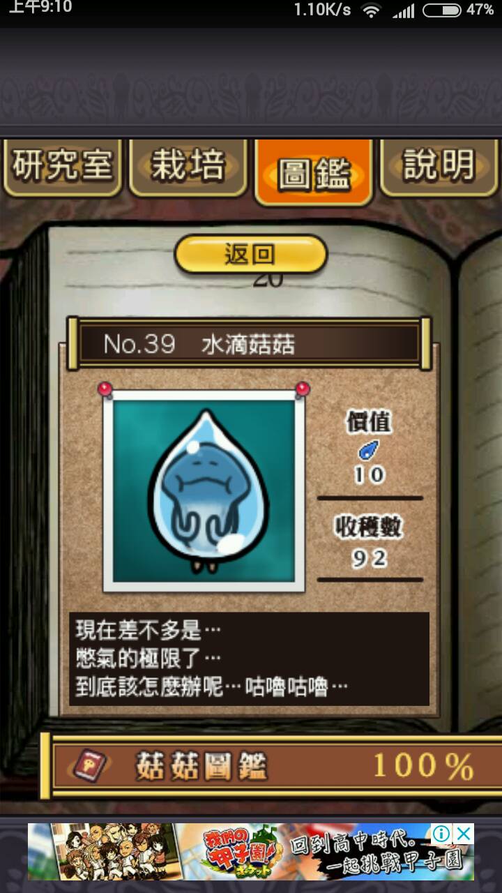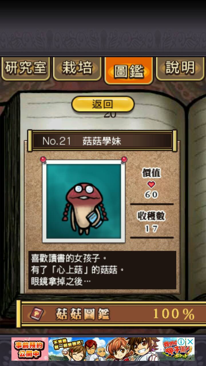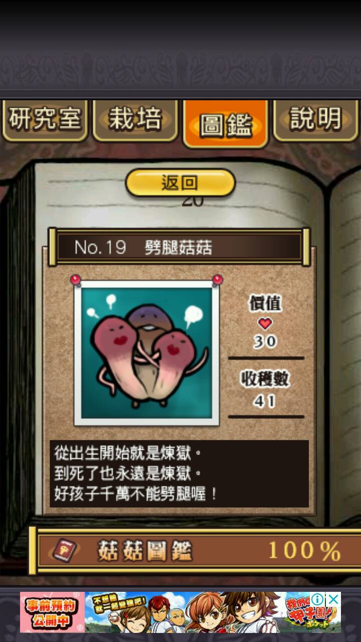 关于玩法介绍,使用药水加速菇菇的成長,等它長好了就滑的一下收集就成了,,,很简单,放置收集向游戏。菇菇有很多种,每收集的新的菇就很兴奋呢(*´∀`)