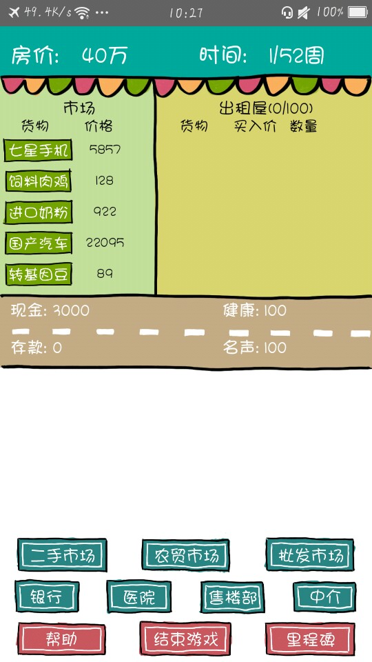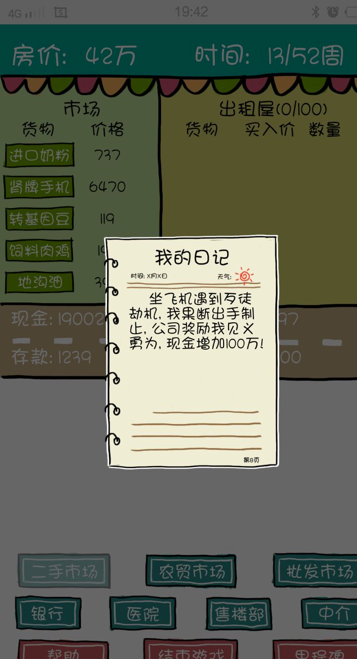 這是個經商的遊戲內容是有個人想再一年之內賺大錢買大房可是不能只說不做 整天做白日夢所以我們開始了經商之路此遊戲的賺錢方法分為兩種1 ,低買高賣賺利潤2 ,鉅額存款錢滾錢遊戲內容很簡單主要是掌握訊息,趨勢決定要買何種商品例如有個商品無人問津價格大跌這時候我們買進結果到了兩個禮拜後卻顯示賣脫銷了這時候我們就要賣出一來一往賺的利潤又放進銀行錢滾錢如此重複就能不斷的累積財富這遊戲基本不會虧錢,只需要想辦法賺進更多的錢不會像某遊戲一樣,賺了大把鈔票,卻因為突發事件死的不明不白初期根據趨勢買些小商品奠基買大商品的錢中期有了一些資金後,開始注意中,大商品後期就只用大商品交易了,時間寶貴阿最後幾周就買個房子結束遊戲房子有很多種最高還有賣30億的目前我就頂多賺到5,6百萬我相信各位一定能賺的比我更多無聊遊戲玩膩了 ,就來玩玩這款輕鬆小品吧!