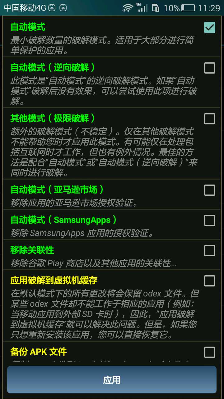 3、在应用列表中找到游戏,点击展开菜单,选择“破解菜单”,点击“移除授权验证”,然后静静等待进度条走满,之后会提示你有40%左右的成功率,无视它,点“启动”。