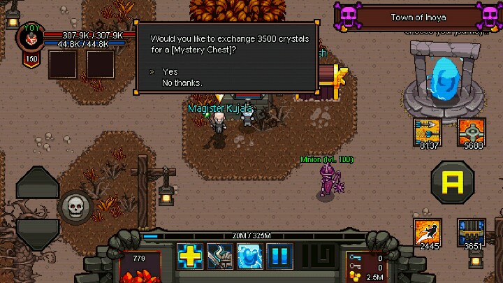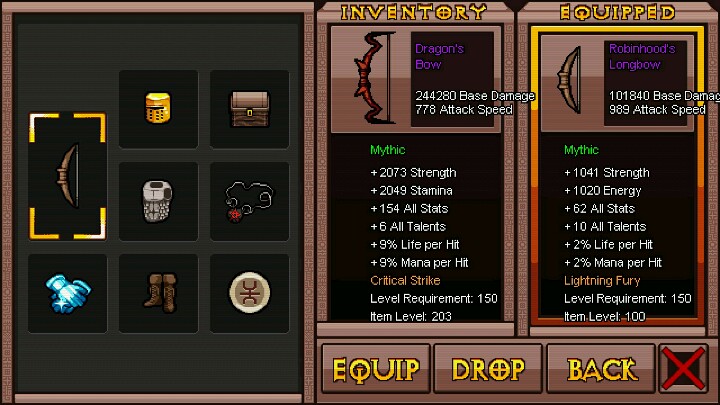 再有我说一下这游戏里的一些幸运的事,有时候刷图会遇上一个背着袋子的哥布林(哈哈哈,打劫!),干掉他,他会掉很多水晶给你。有一种怪他血条左右有黑色骷髅的(我去,一看就知道是大哥),宰了他,必掉橙、紫装(没记错的话,这种怪是叫远古怪)。有一种箱子是紫色的,刷图很少见的到,重要的是游戏里的好东西都有几率开到(我只开过水晶,神器,紫装),这种箱子能用3500水晶跟一个npc换(跟这npc对话,他话中有3500)。闯关卡时,每过一个小关卡都有可能出现一尊塑像,碰一下(神呐,请赐予我力量),然后要么帮你加属性,要么帮你减属性(总之,无论加减,挂了一次后又会变回来,药水也是如此)。