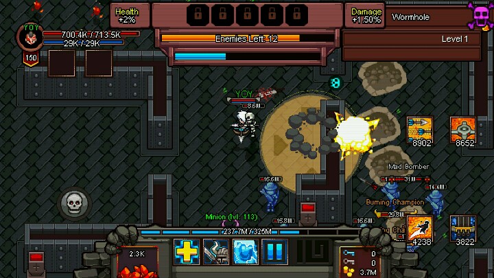 这游戏共有八大关卡,每个关卡分四个小关卡,有七种模式(最后的模式连普通怪都有上万血量),总的来说,这游戏有很多的随机性,使其可玩性相当的高,喜欢像素风格的朋友千万不要错过哦。