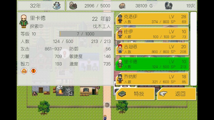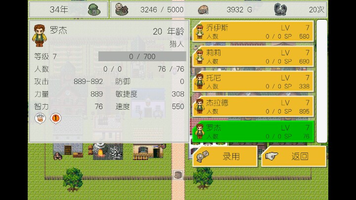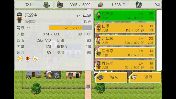 我走的单队伍发展路线,一农场一市场开局,前期两铁匠一医生混过去。重要:每天都招募,刷“孤军奋战”(如图)这个特性的铁匠!铁匠!铁匠!注意看攻击力和速度,太低了没用。一旦刷到一个属性不错的孤军奋战,恭喜你,可以躺了。所有资源堆他,好装备、人口全部给他,带点恢复药,怪来了就只派他出击,前期的怪轻松虐。