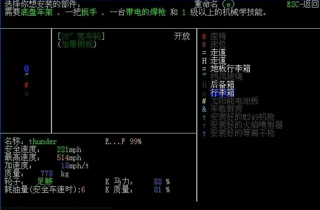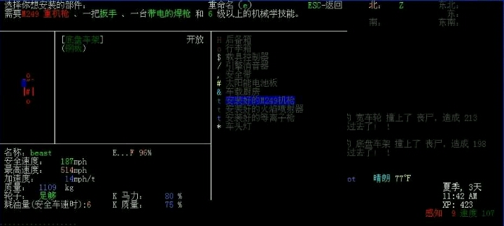 有了石铲,就可以按*打开建筑菜单连挖两次挖深坑了,不过比起大杀四方来,还是先建立生活基地更重要,选一个适合你的民居,这个看个人喜好,要求不多,一是床的位置要在房间中心一侧,不能靠着外侧墙壁,否则睡觉时扩散的气味有可能引来敌人,二是门口到卧室至少要有一个房间隔开,便于整理东西和堆放木头之类常用杂物,三是一定要有可以取水的厕所,然后把所有的门和窗户都关严实,把收集到的重要物品都放到卧室里分类放好,按shift+d再选方向可以把身上的东西放到柜子或者冰箱之类容器里面,整理大量同类物品的时候可以按/打开整理菜单如选中身上的10个塑料瓶再按m就全部放到地上了,这个菜单还可以检查和整理身边9格范围内的物品,然后在门外挖深坑,身上带着标准木材按e和方向键在坑上搭一条通道,不用的时候可以再按e和方向键取下来,标准木材靠砸烂或拆解家具都可以获得,如果收集到了螺丝刀和锤子,按*在建筑菜单选择拆解家具再选目标可以获得更多材料,但是要注意的是拆解和砸烂获得的材料不同,有时候拆解更划算,比如初始避难所的寄物柜拆解可以获得厚钢板,有时必须硬砸,比如展架拆解可以获得一堆完好的钢管,但只有砸烂才能获得制造厚钢板的金属零件。