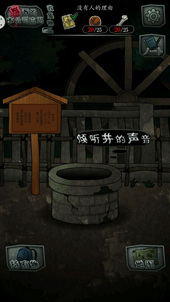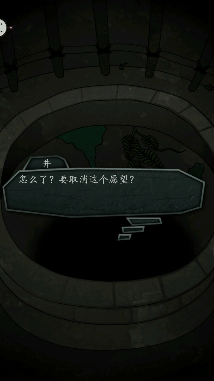 画风音效都不错,没有那种需要洗裤子的恐怖高能,夏日微微凉意的氛围把握的很有分寸,讲的是村里现在唯一的男孩,被一口水井里的声音吸引的故事。主线是男孩(玩家)向水井倾诉愿望,每个愿望通过集满三个物什并扔进水井来实现,每地图都有三种可收集物件,每次点5下会进入冷却,点界面正下方的沙漏可以缩减时间(经常点掉手电筒),因为这个设计,需要等待的时间大大减少,不过也使得玩家注意力会一直集中(手指点击+关注冷却时间)。界面上面可以看到物品所需数量,物品所在地图会有红色感叹号提示。随着愿望的实现,时间和剧情会推进,也会解锁新的地图。