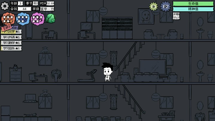 玩了第二个人生,家庭富甲一方,天生条件特别好,还有家庭教师!刚开始启蒙文字和数字,等到上幼儿园后就一直教手工课,才知道兴趣班要自己去买id卡的(:3_ヽ)_但是明显之前那个钱不够,我现在不想玩下去了,因为我感觉下一个人生肯定不会这么完美的,不想破坏这份完美了23333这是两份截图的属性,一个三岁吧,就刷满了!!!!我之前那个小康家庭的。。。死活刷不上去,而且还会瞌睡,现在。。。有大部分时间用来睡觉,避免瞌睡,我。。。现在算是信了赢在起跑线这句话了,勤能补拙都是假的〒▽〒