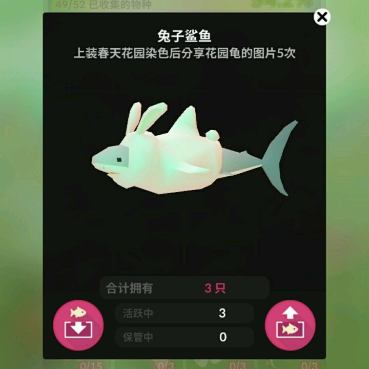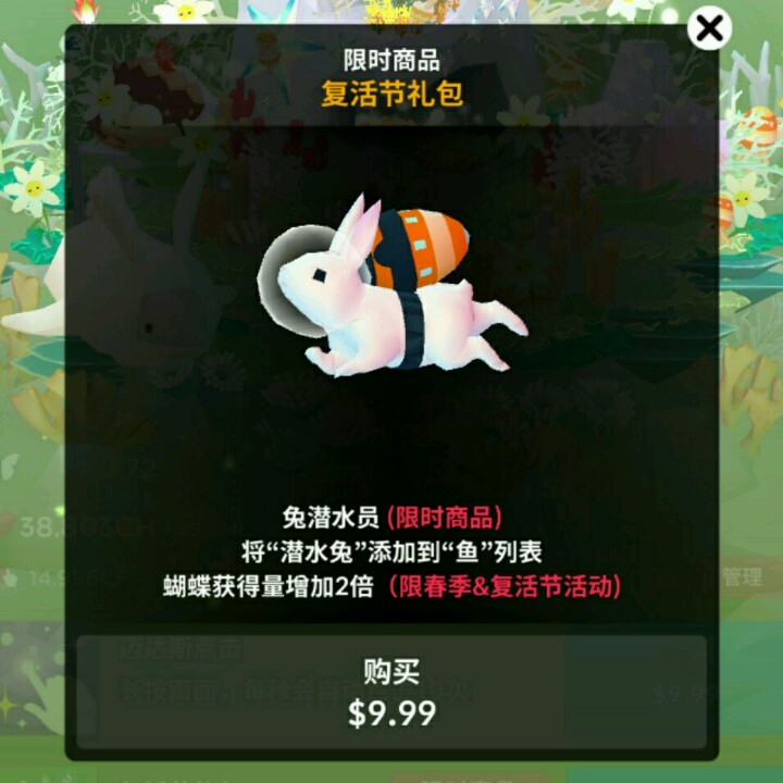 好,接着说回活动~这次的春季&复活节活动不再是用糖果来换了,是蝴蝶~新增了礁石服装“春季花帽”,珊瑚染色“春天花园染料”以及主题“温暖的春海”,还有12种用蝴蝶兑换的鱼和1种氪金的礼包鱼。