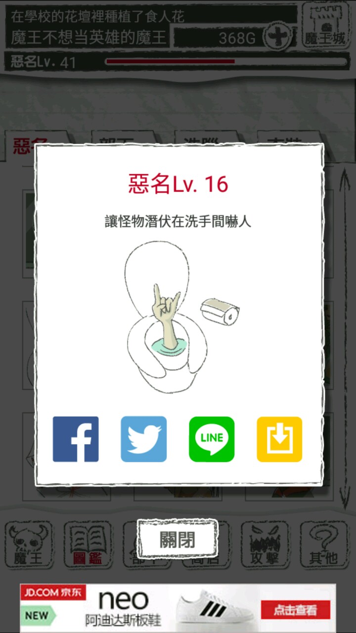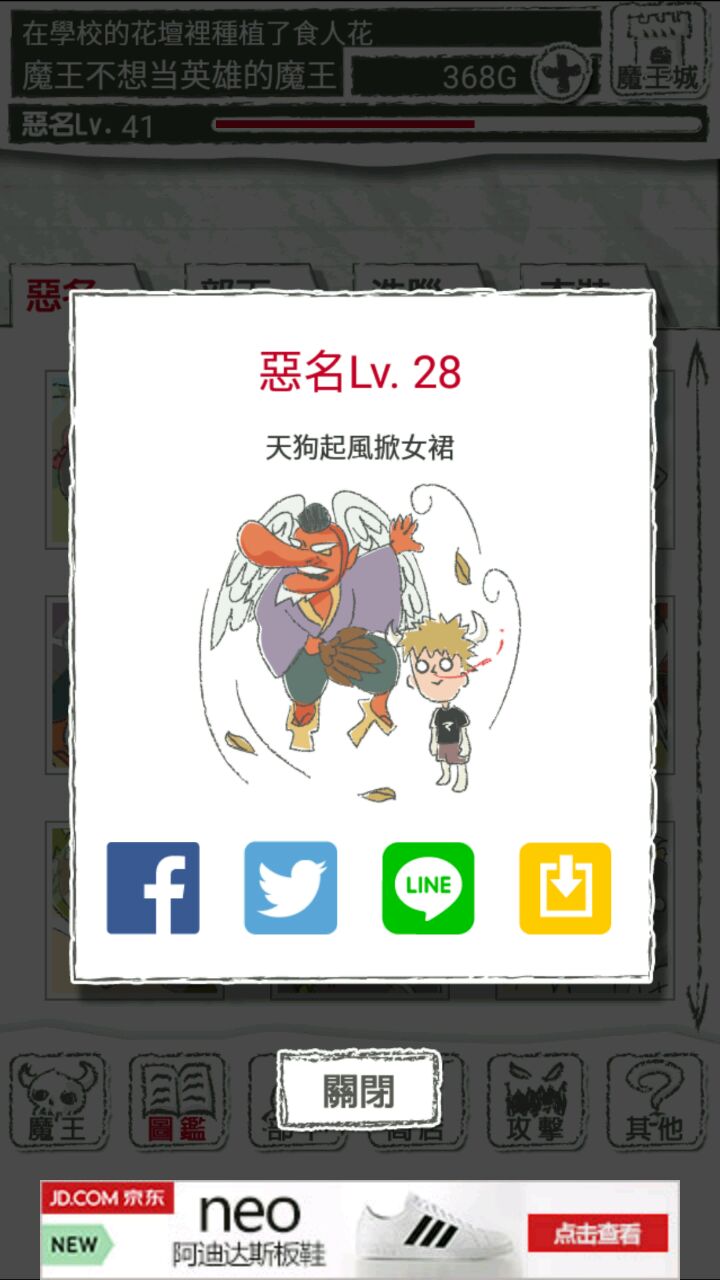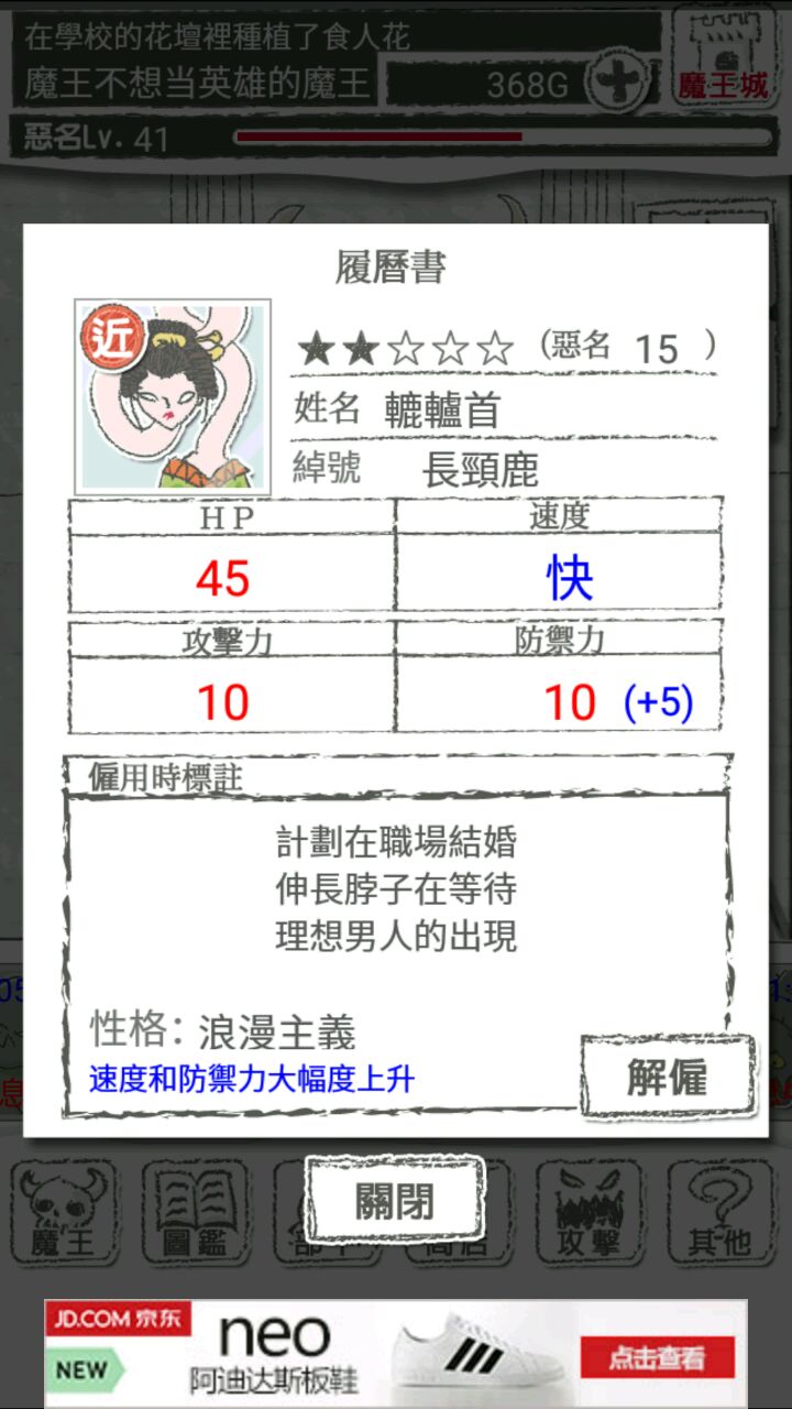 被画风吸引住的玩了一晚上,被小小萌到了,结合之前大致搜了下的新手攻略,开个水点的半技术半记录贴吧吧吧吧~魔王设定,有二周目勇士可以被洗脑,收集的被洗脑的勇士用处多多开头引言萌点自寻每一级都有相应的所谓“恶名”,插画有有趣之处“部下”洗脑”图鉴下拉再拉,会有隐藏图鉴注意左上角的远程,近战,速度的克制关系先想到这么多,楼下继续晒晒图以及,好久懒得打字,大半夜了也不想组织语言,自己稍微嫌弃下内容太水(ΘへΘ)