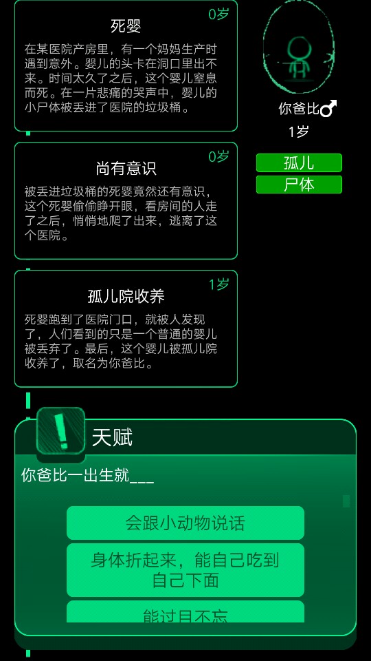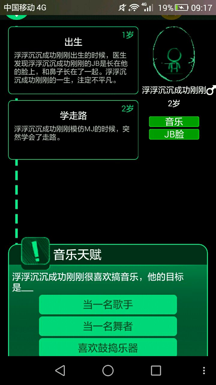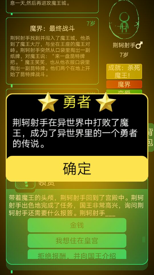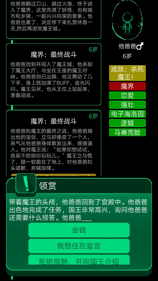 又一个前期会很可能遇到的选项,说是"台风,然后一个老人说别听风就是雨"这时候别选拿下雨伞,要选以香港记者的速度走掉(不知道是不是这么说)连着两三次都有黄金成就,还有去魔界的方法,就是在芊芊期,也就是5到15岁时,可能会有一个和小伙伴出去野营的事件,详细就是叫你去找吃的,这时候选有五片叶子的三叶草就行了。和魔王最终交战的时候选带の选项的剑就能过。