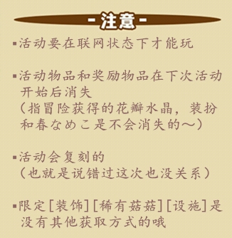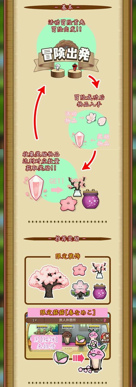 接着活动攻略~翻译了下官方的活动说明的【基本】【奖励】及【注意】三项,【重点】是介绍具体方法的就不p图了(懒orz)之前的ィべントスペース就是活动场所,点击“あそびかた”可以看到游戏方式(就是我翻译的下图啦)主要玩法还是冒险得奖励,奖励达到一定数量就能获得装饰、道具。需要注意的是20分的冒险可以直接去,60分的需要5花瓣,120分则需要5花朵。兑换详情点击“ごほうび”可以看到~最后获得樱饼就可以放到[旅人休憩所]招来新的春菇菇,很便宜,只要6树枝1200NP(所以数值也很惨……)